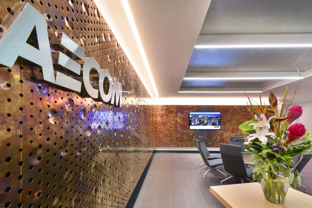 At the AECOM Office in Cleveland, a copper ImageWall® with the Dirty Penny surface was shaped by custom emboss/deboss punches. The iridescent shine, combined with such unique texture, created the rich yet contemporary interior environment desired.