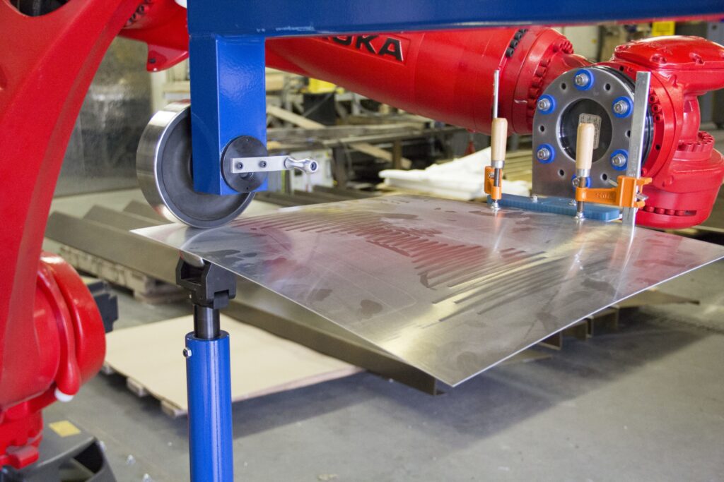 A year ago, Zahner introduced Ruby, a Kuka KR270 R2700 robot, with the intention of testing novel ways of incorporating robotics into manufacturing processes. Ruby has since become an integral part of the R&D team, proving herself invaluable in testing theoretical and practical applications. For the double curvature challenge, the theory was if Ruby could be ‘taught’ to form panels, we would be poised to dramatically expand what is possible to build in architecture.