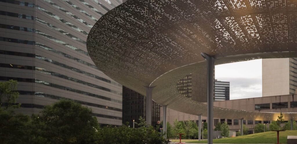 HKS and Zahner have also collaborated on another small but symbolically rich project—Pacific Plaza Pavilion in Dallas, designed in collaboration with landscape architecture firm SWA. Situated near HKS’s headquarters, the park pavilion needed to reflect the site’s history and its railroad roots.