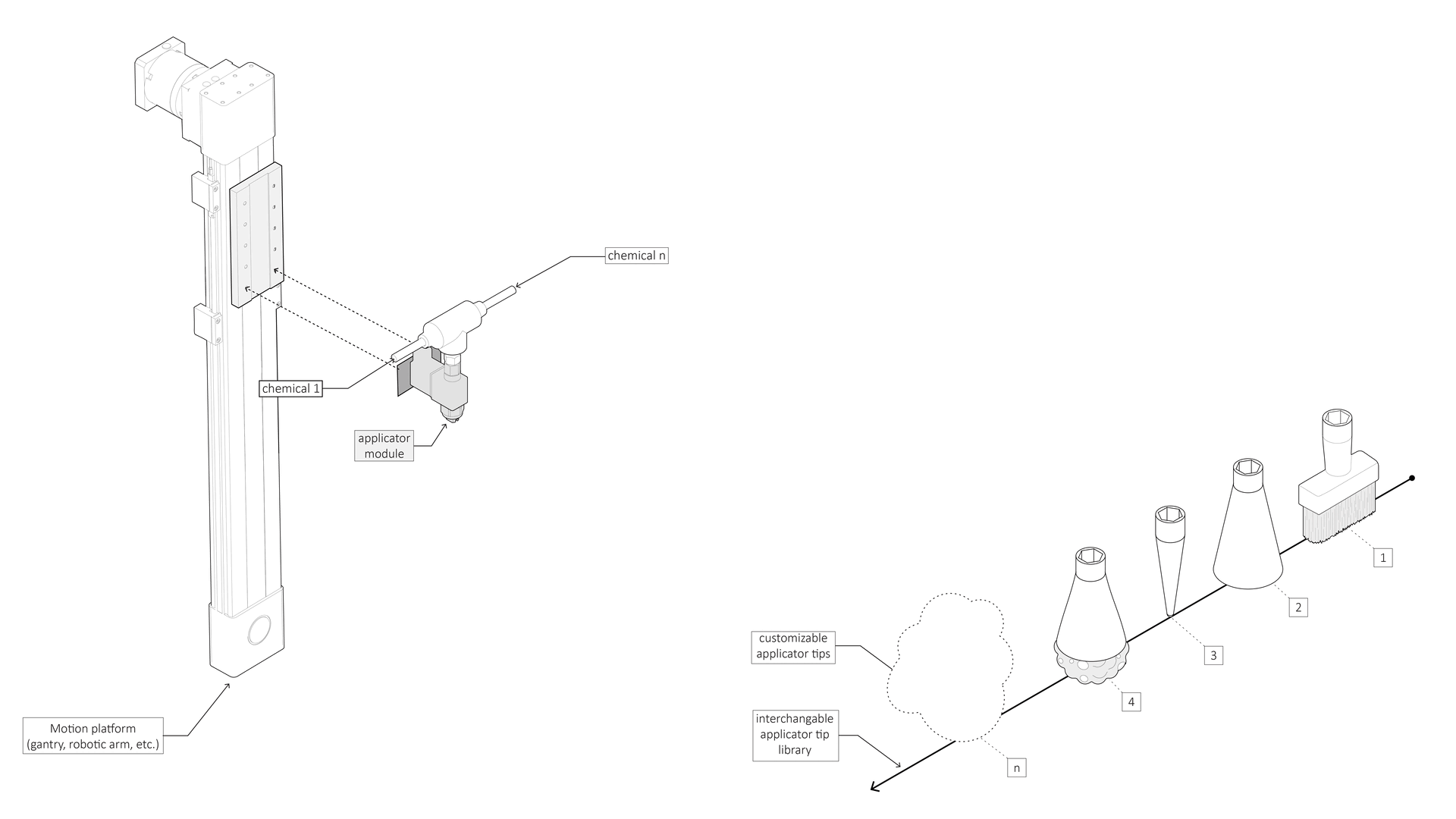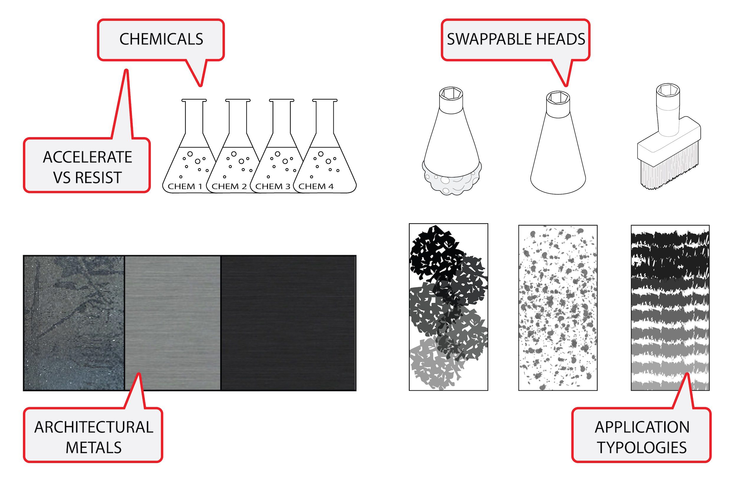 Zahner’s research extends beyond form into the behavior of metal surfaces themselves. Selective Patina, with its patent-pending process combining chemistry, fluid dynamics, and motion control, was introduced as a programmable system to add another dimension to patinas and finishes.