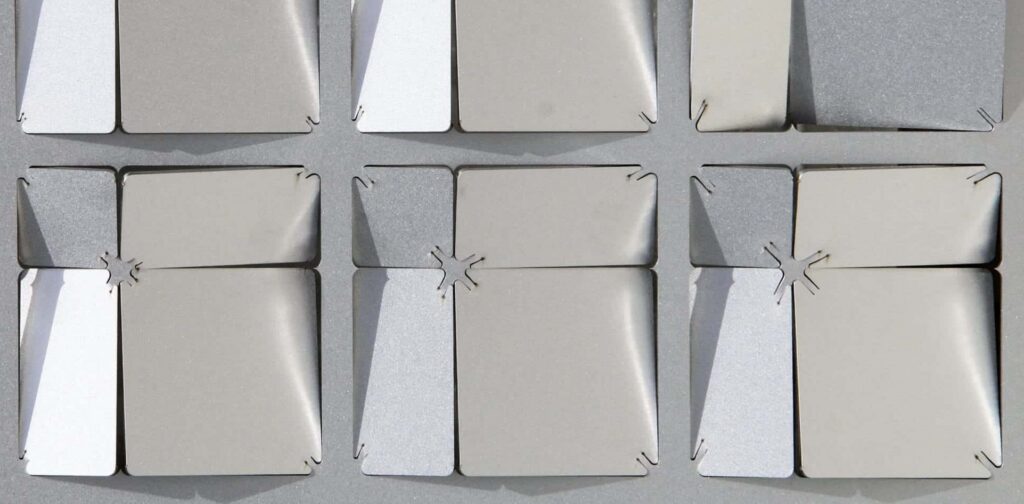 Louver Surface is an advancement on Zahner’s textured panel technique used on projects like the Bloomberg Center at Cornell Tech designed by Morphosis or the Davidson-Gundy Alumni Center at UT Dallas designed by Overland Partners. Unlike those projects – which were composed of a grid of tabs suspended in a frame – the entire face of Louver Surface can be articulated. Below are various levels of articulation.