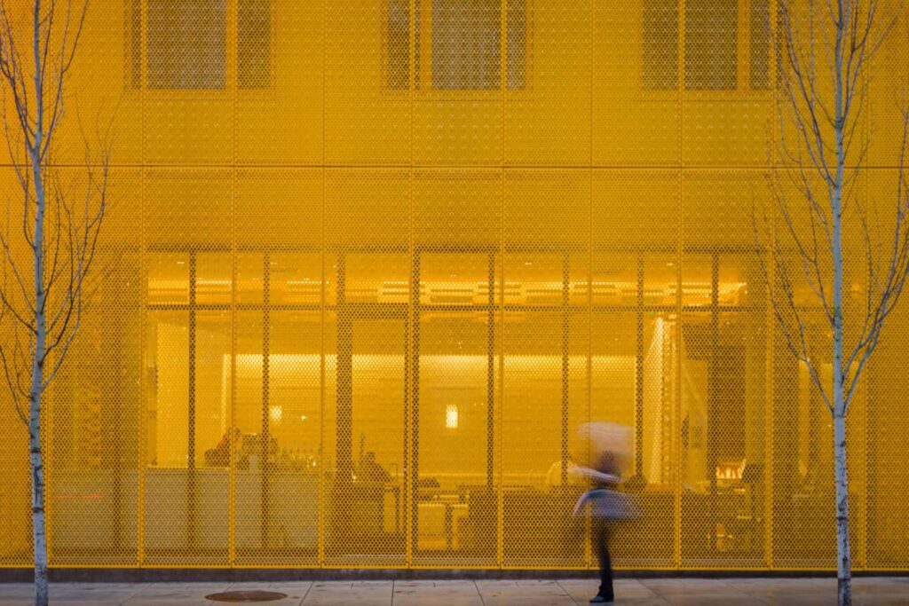 Perforated metal not only lets light enter a building, it can also be backlit to project light outwards. This creates the opportunity to design glowing facades that are eye-catching, provide useful privacy benefits, and meet open area requirements.