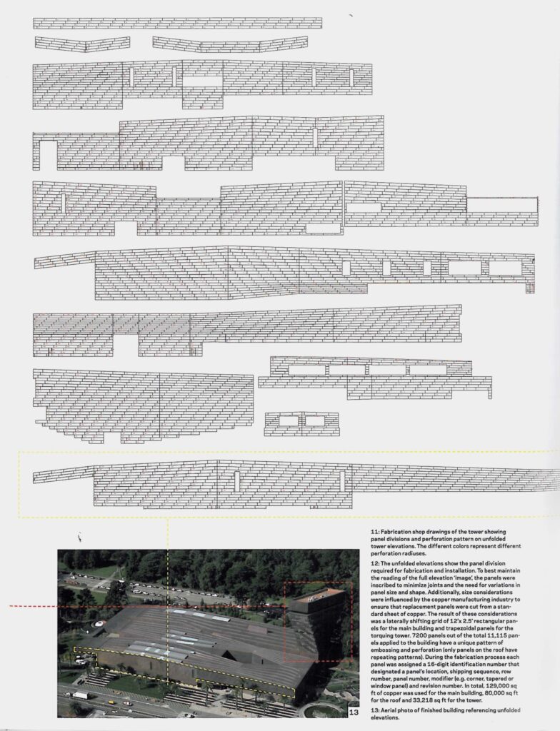 …The images presented here, in roughly chronological order, tell the story of the processes behind the design, fabrication, and installation of the de Young Museum’s copper skin. What unfolds is a process of translation through which an initial concept, first captured in a two-dimensional image, becomes a 3-dimensional building surface.”