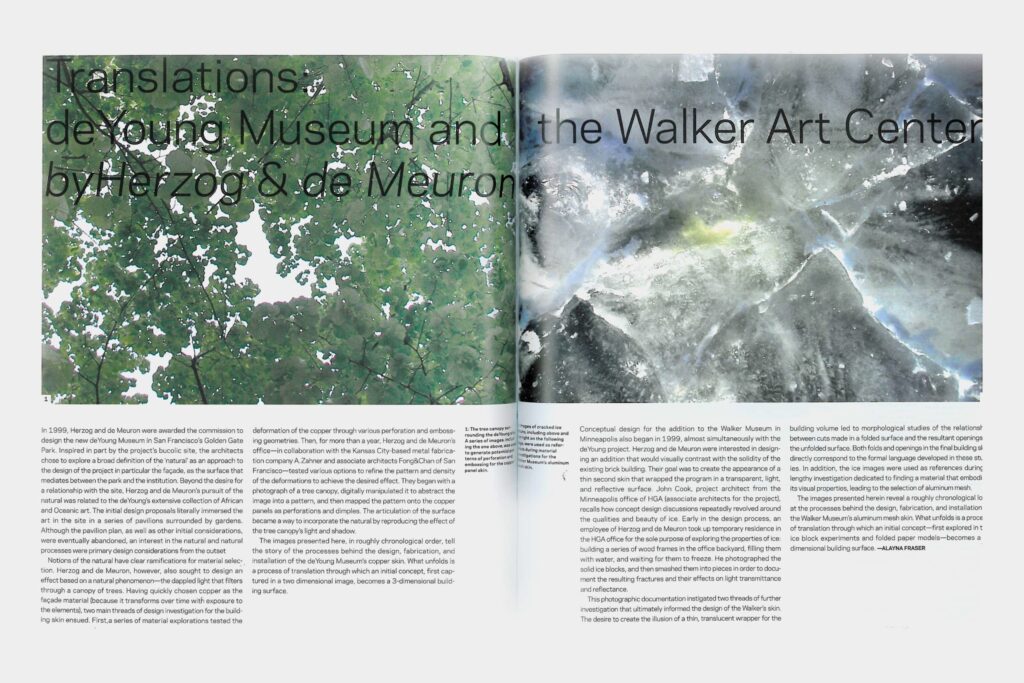 Opening pages of Translation: de Young Museum and the Walker Art Center by Herzog & de Meuron