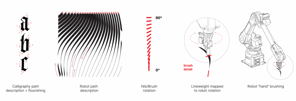 The Labs team maintains a rich discussion about the place of automation in our processes, looking for the best of both moments between handmade and machine-made. When script fonts are printed on a conventional roller printer, letters are divided into rows of pixels placed on the page. While efficient and flexible, this process can eliminate conversation about the quality of the line and in some ways the voice of the calligrapher/typographer. However, applying patina chemistry onto panels with a robotic arm gives the designer full control over the application.