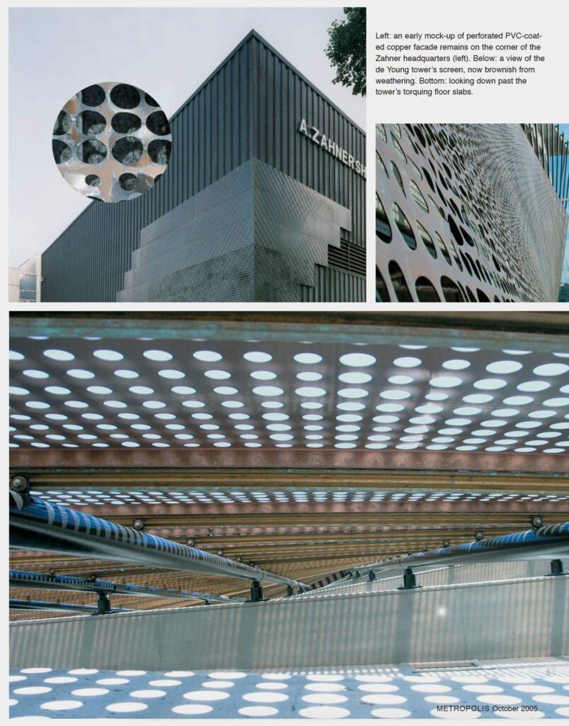 ”On a glaringly bright June afternoon in Kansas City, I find myself standing outside a factory building admiring the effects of the Missouri climate on panels of perforated copper. “When we were constructing this we had a severe ice storm in Kansas City,” says my tour guide, Paul Martin, a mechanical engineer who had helped design the panels. “After it melted away it had the most spectacular purples.” He points to the verdigris streaking in the cinnamon-colored surface. “The way water falls down copper…there’s no way to replicate it.”
