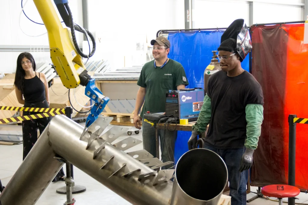 Once the robot had a means of holding material, the workflow and respective welder/robot tasks were delimited. The process was a coordinated team effort between a robot operator, a welder, and the robot arm itself.