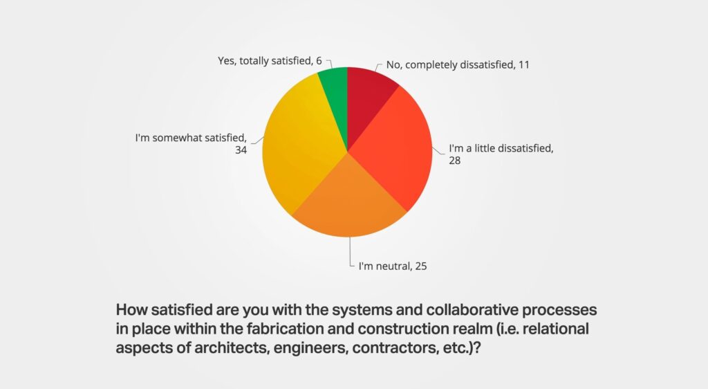 94% of responders were not completely satisfied with the tools available. Several participants expressed the need to include owners, contractors, and key fabricators at the beginning of project, calling for “Bold leadership to combine multiple disciplines.”