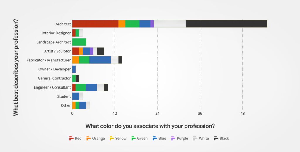 The above chart provides an idea of what professionals associate with the industries that we serve at Zahner. Turns out, architects really do like black!