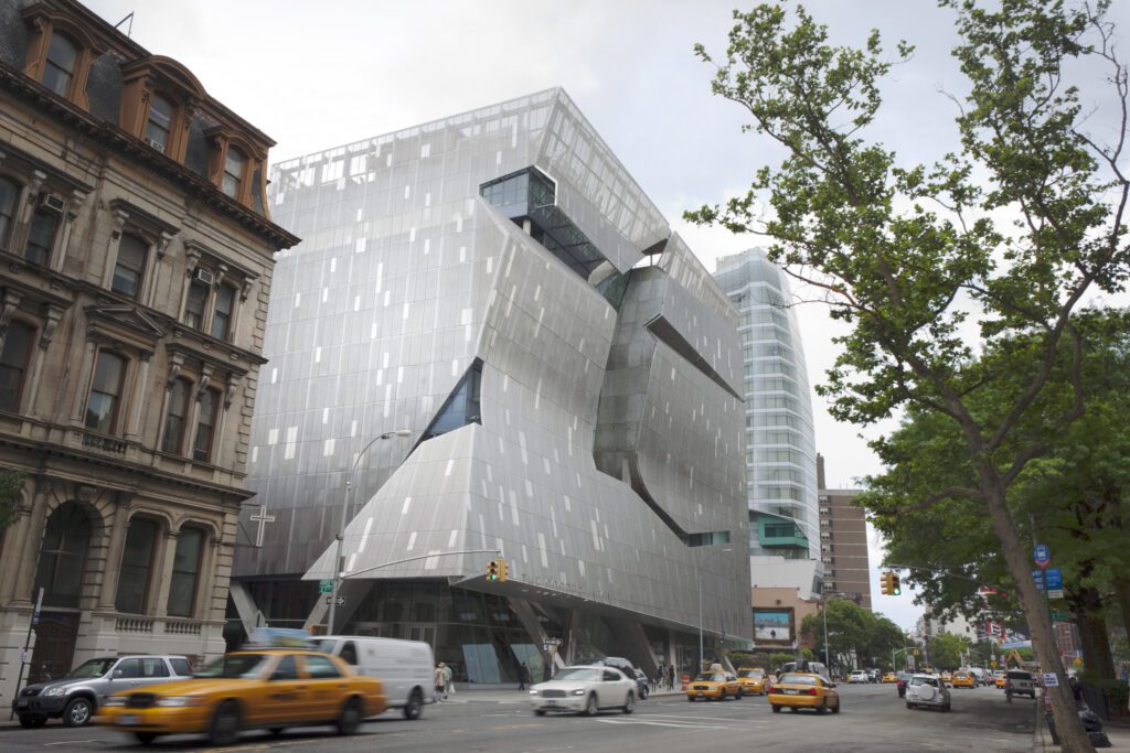 “Mr. Mayne’s building does not shy away from this debate by trying to fade into the background. Seen from the old Cooper Union Foundation building across the street, its big concave facade is enveloped in a glittering perforated metal screen, like armor, so that it’s hard at first to get a grip on the building’s scale. A big vertical slot is cut out of the facade’s center, as if it had been ripped open