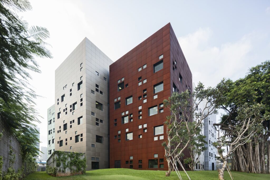The new DeYoung Museum is clad in copper. Mismanufactured, damaged, or scrap sections of the copper were recycled. All the perforations were recycled. And because copper metal is more resilient, it will not crack during an earthquake.