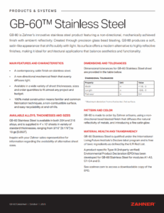 GB-60 is Zahner’s innovative stainless steel product featuring a non-directional, mechanically achieved finish with ambient reflectivity. Created through precision glass bead blasting, GB-60 produces a soft, satin-like appearance that shifts subtly with light. Its crystalline surface offers a modern alternative to highly reflective finishes, making it ideal for architectural applications that balance aesthetics and functionality.
