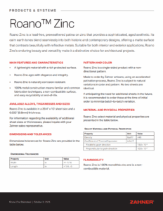 Roano Zinc is a lead-free, preweathered patina on zinc that provides a sophisticated, aged aesthetic. Its calm earth tones blend seamlessly into both historic and contemporary designs, offering a matte surface that contrasts beautifully with reflective metals. Suitable for both interior and exterior applications, Roano Zinc’s enduring beauty and versatility make it a distinctive choice for architectural projects.
