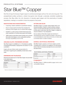 Star Blue brings the beauty of aged copper to architectural designs without the centuries-long wait. This preweathered surface achieves a vibrant blue-green tone through a precisely controlled weathering process. Star Blue offers the rich character of naturally aged copper with the practicality of modern expedience, making it an excellent choice for projects of any scale.