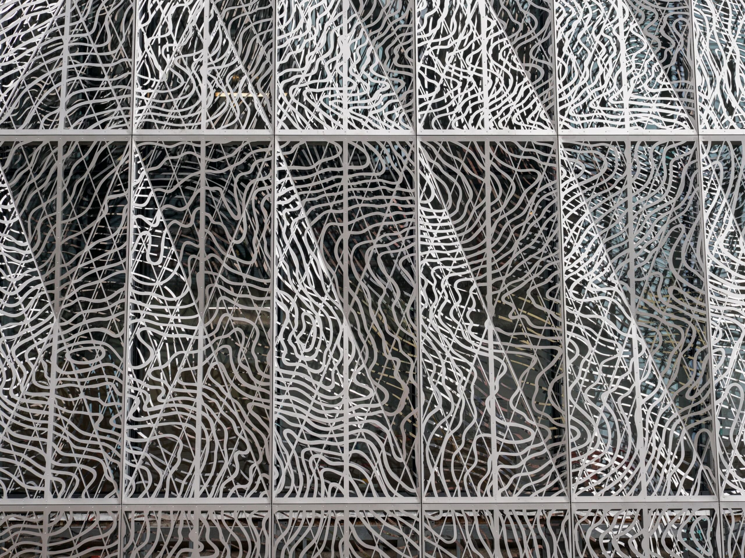 Angel Hair is a Zahner material process developed to soften the high-reflectivity of standard grain finishes. The patented process uses precision-controlled machinery to etch stainless steel with a fine grain and a dual surface, with one level of texture below another. The tiny circular scratches applied to the metal alloy will disrupt symmetry to produce a consistent luster, eliminating striping and scalloping effects. Available on a variety of metal alloys, this is the finest, smoothest, and most uniform light-diffusion metal surface available for architectural metal.