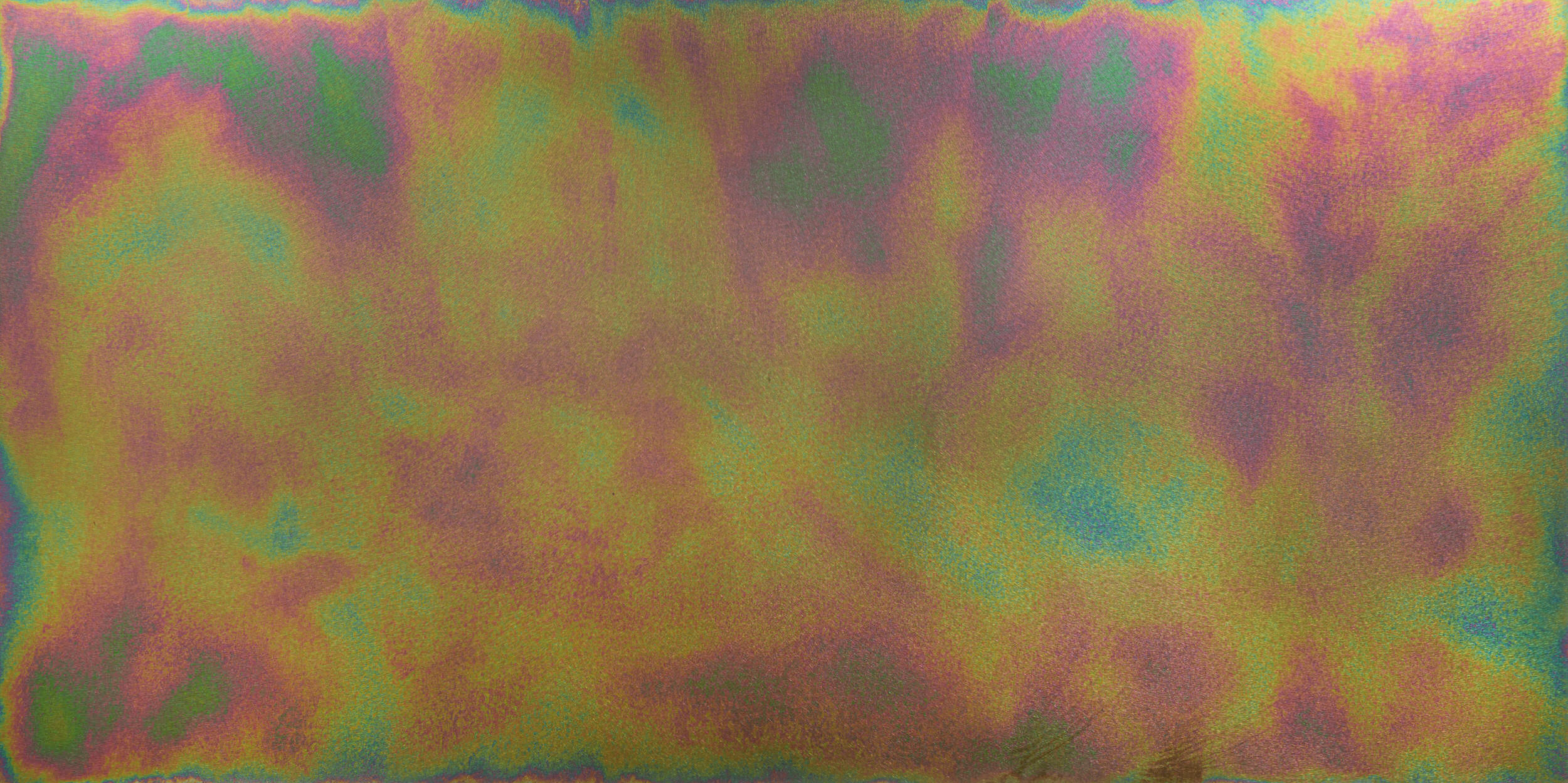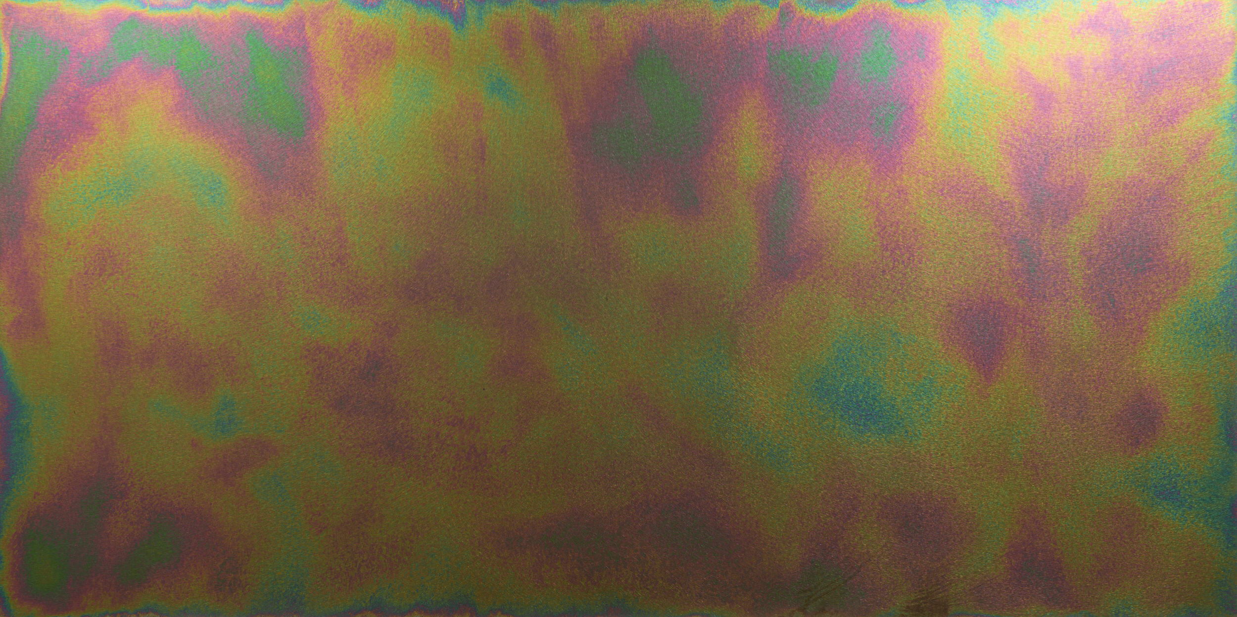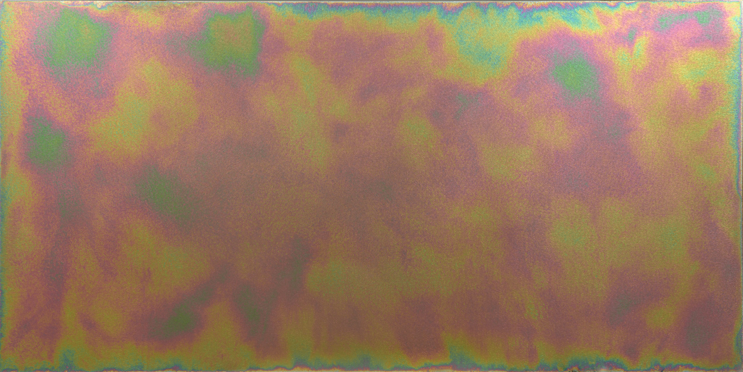 That formula was cataloged and tested further on larger sheets with various application methods and dwell times which were found to lighten or darken the iridescent effect depending on titration and timing. The solution used to create the effect does not contain any strong bases or acids, does not harm the environment, and the cured finish can be easily cleaned with common glass cleaners.