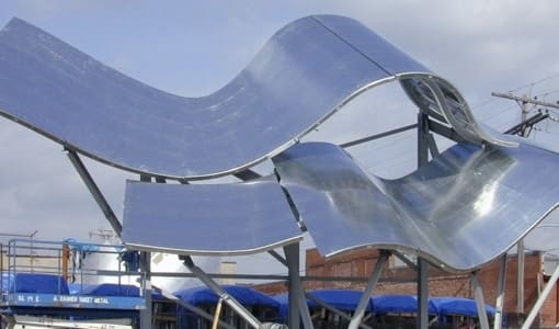 © A. Zahner CompanyThe freeform wave facade that sits atop the Sea Turtle Café was fabricated using Zahner’s ZEPPS™ technology, which combined the framing structure and the exterior skin into a complete curvilinear system. The individual wave units were pre-fabricated in our shop and shipped to the job site, where Zahner field technicians installed the full facade.