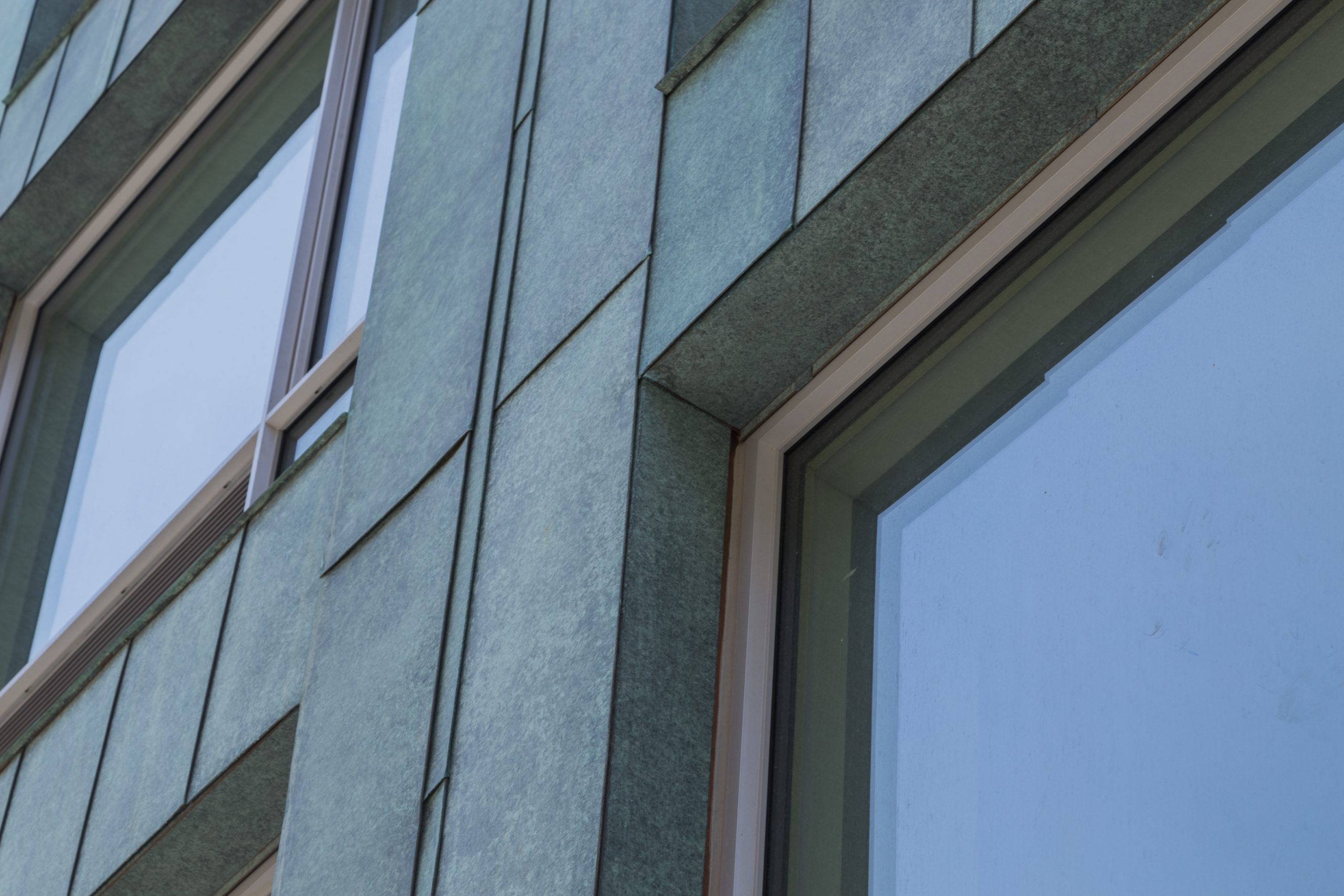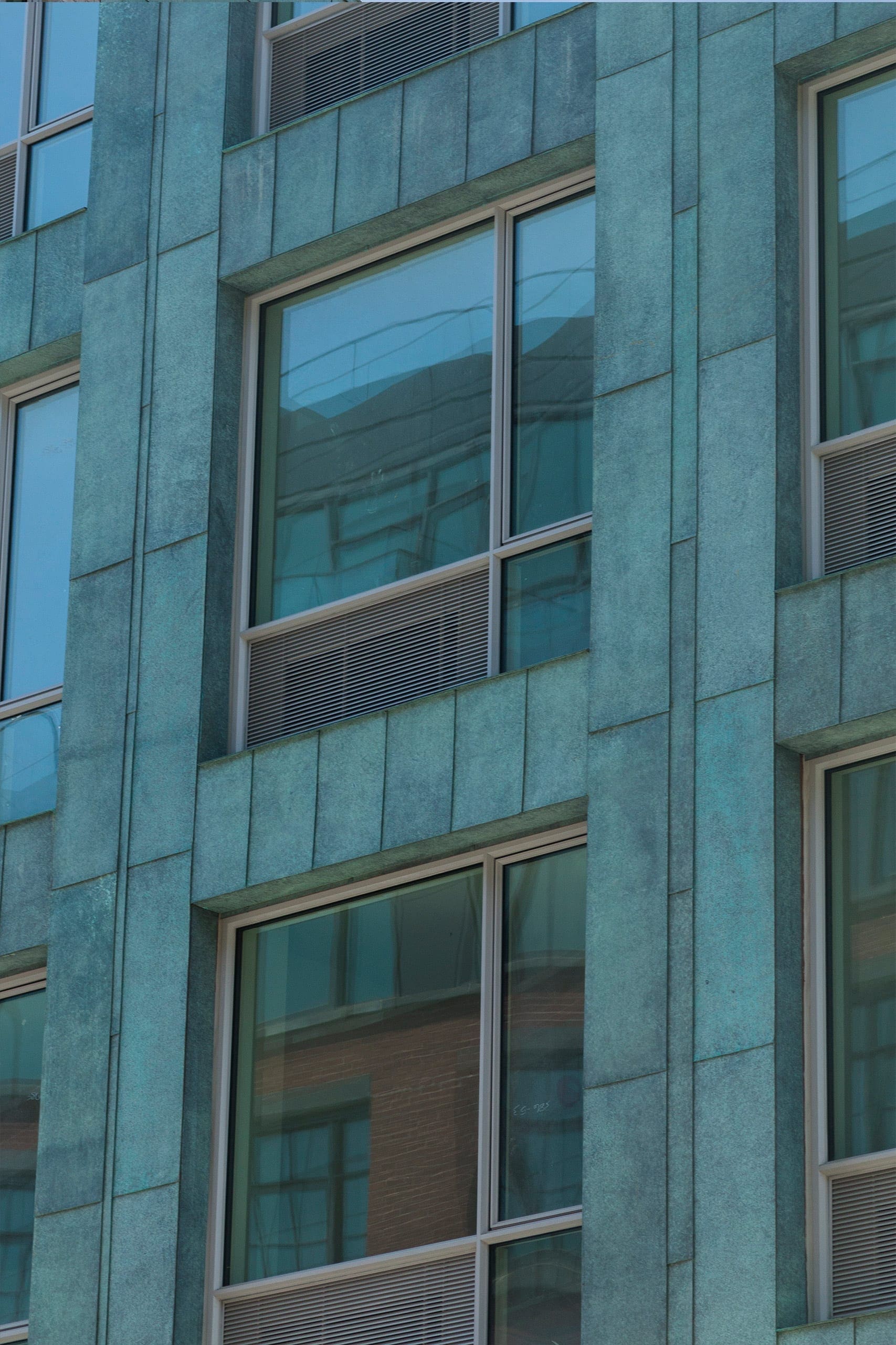 The seven-story building is a former button factory and manufacturing warehouse, developed by Great Point Properties to serve the Williamsburg neighborhood in Brooklyn, New York. The building’s facade is divided between two distinct blocks of various sized blue-green copper panels produced on Star Blue copper, a standard antiqued copper patina developed by Zahner.
