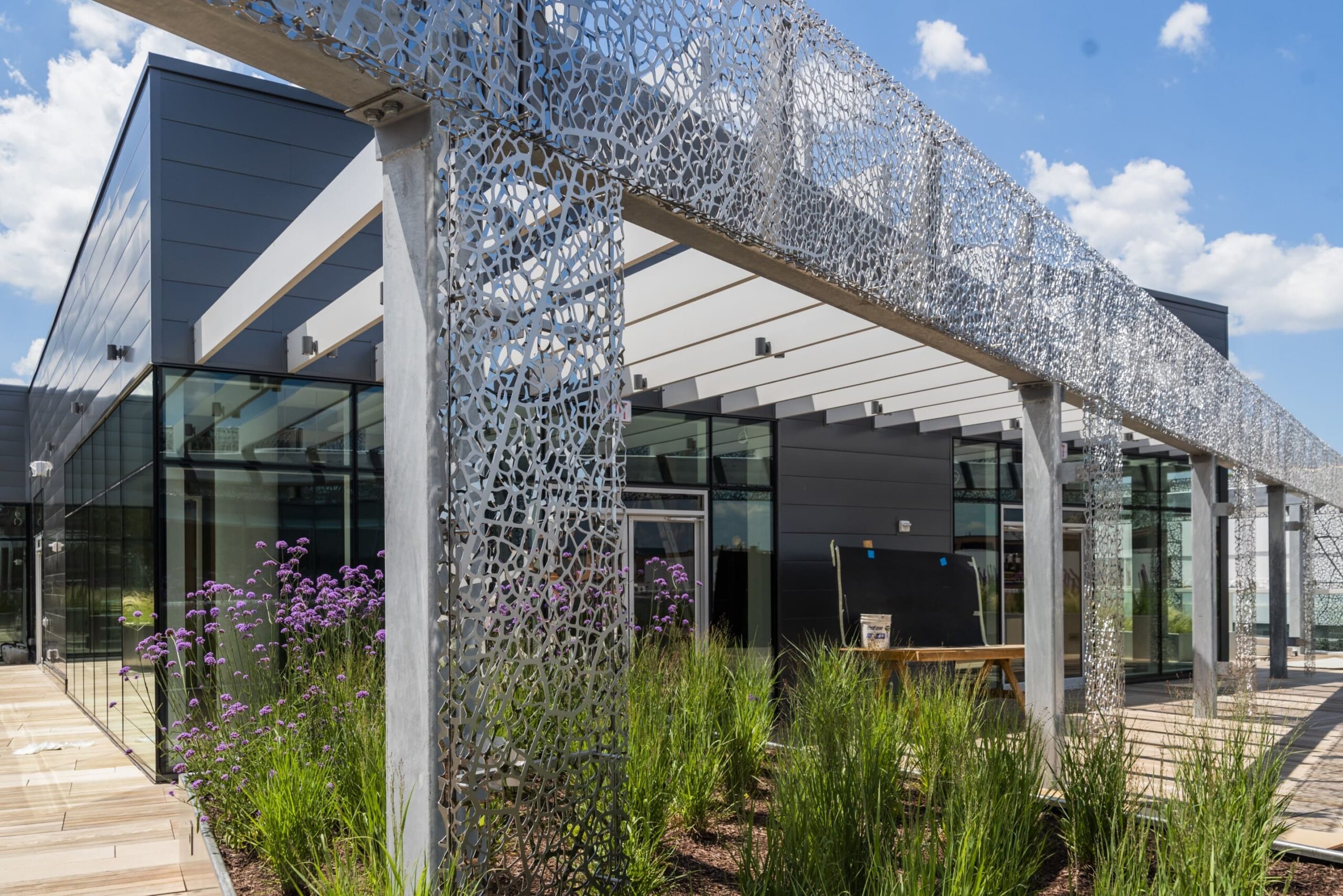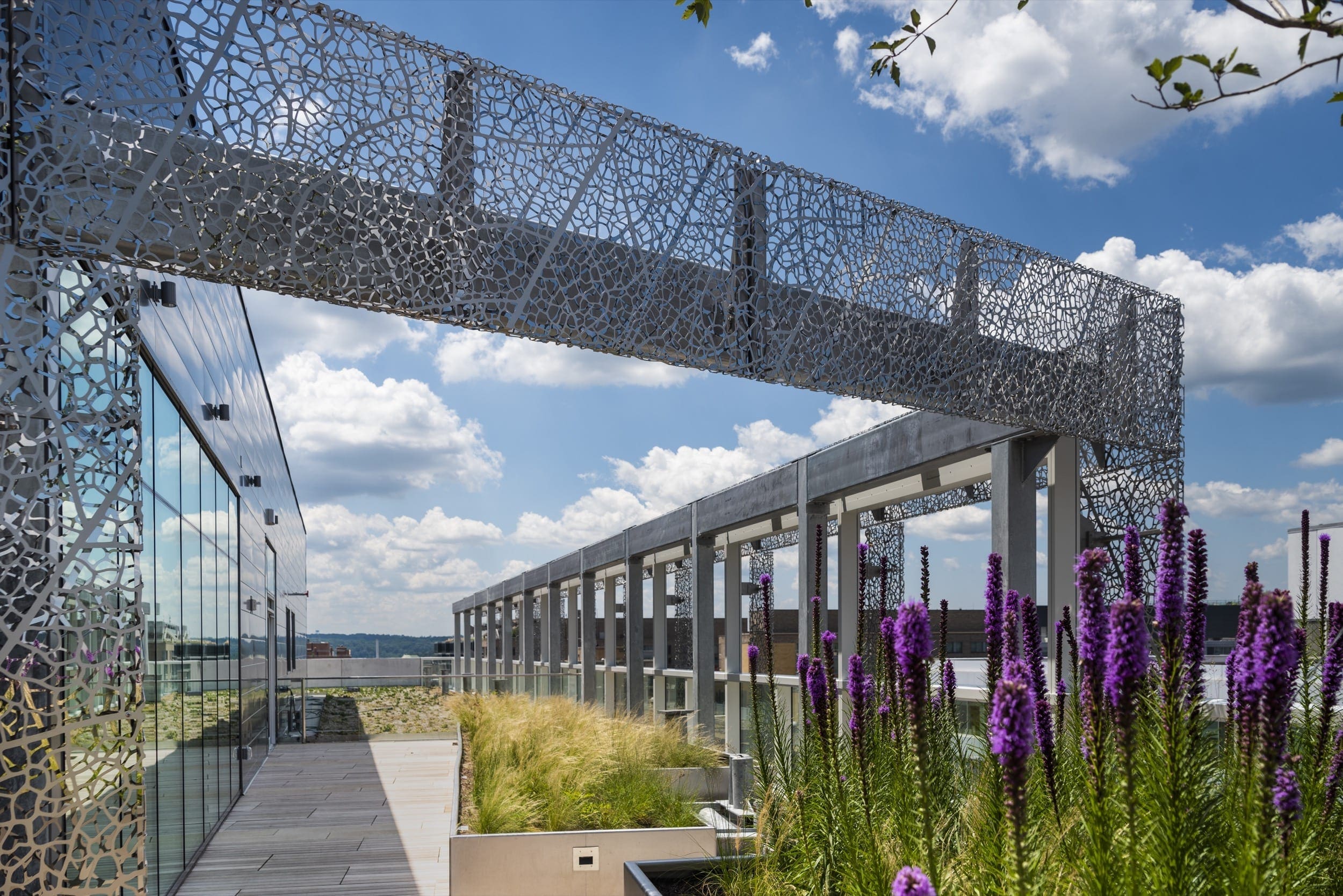 The 2100 L Street NW office development is a new 10-story, 190,000 square-foot, signature property located in DC’s Central Business District. Its index of building amenities includes a stunning, landscaped rooftop terrace and lounge featuring dramatic views of the DC skyline. A dual-sided stainless steel façade, designed by globally acclaimed artist, Jan Hendrix, clads the exterior and continues onto the roof as a decorative screen feature.