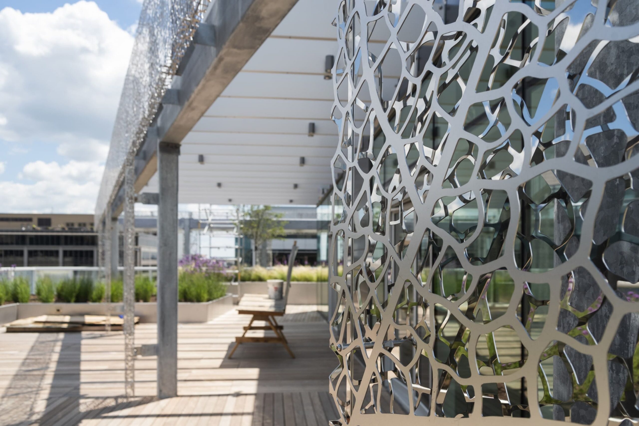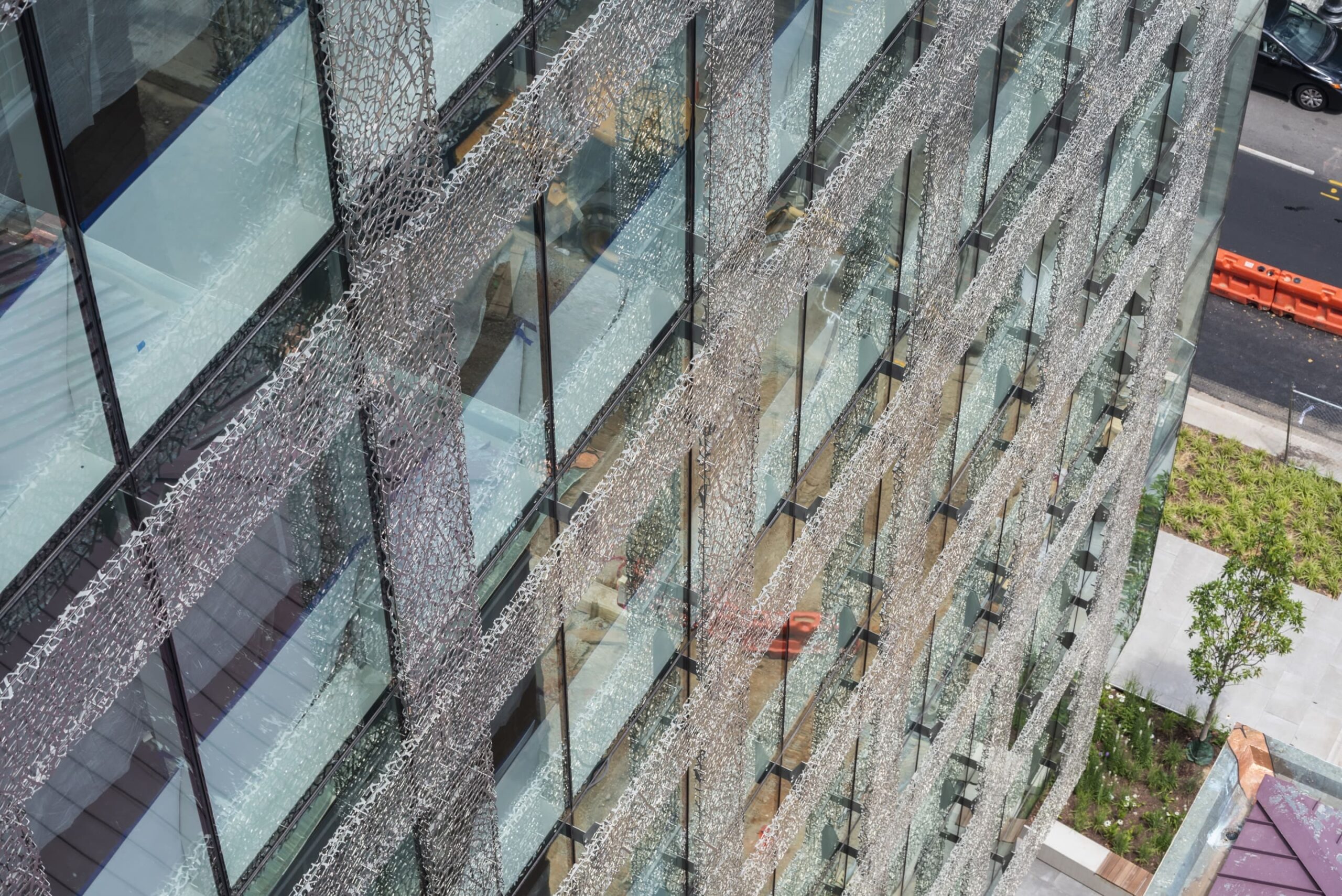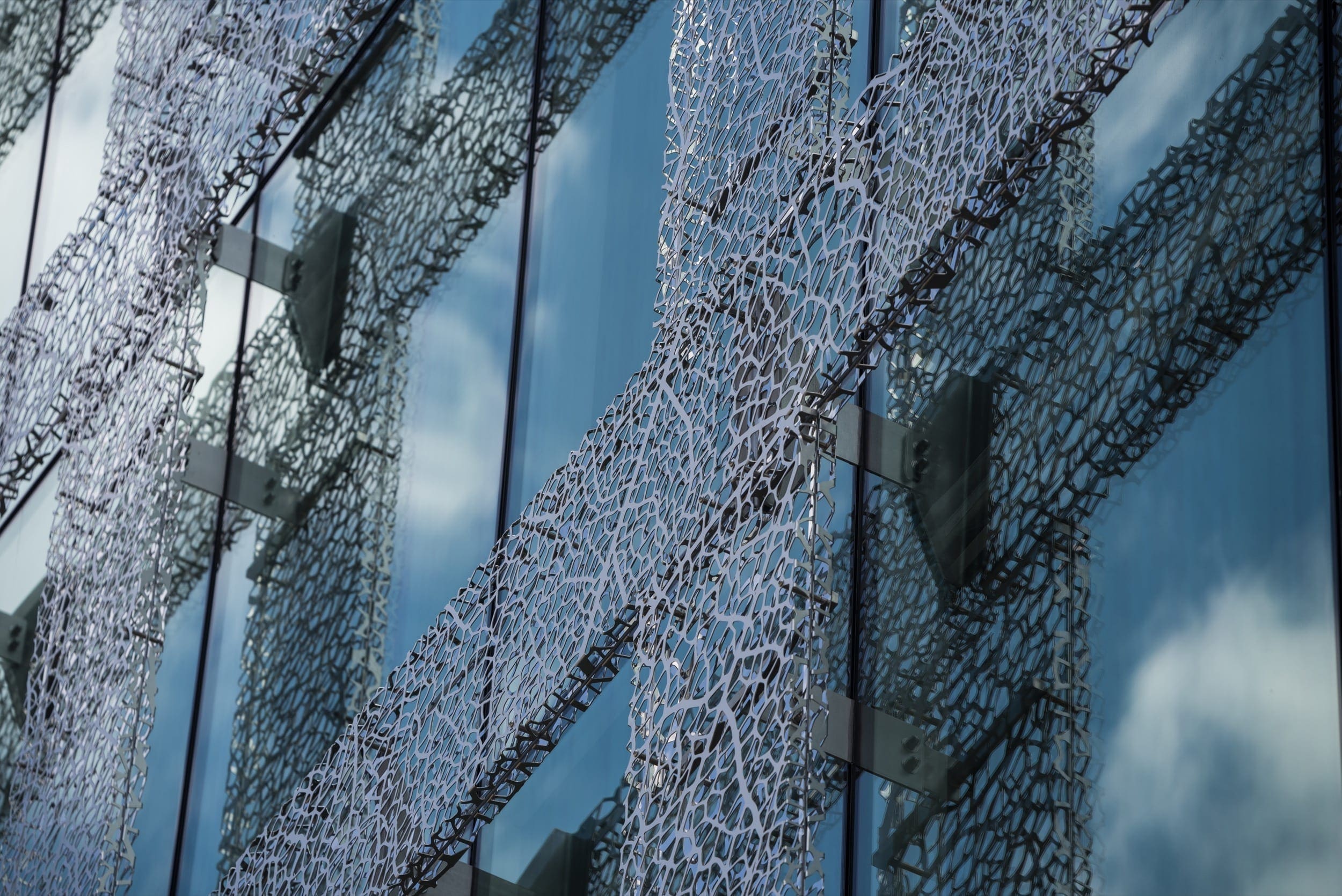 Zahner worked closely with Jan Hendrix and Akridge to achieve the fine veil of stainless steel art panels that adorns the façade of the 11-story building. The design uses the motif of the willow oak tree that is found across Washington DC. Zahner engineered, and fabricated the custom-finished stainless steel panels from 2 layers of 2.5 mm stainless steel. The outer surfaces are finished in diffuse reflective Angel Hair® while the inner surface is highly polished stainless steel. Working closely with the artist, Zahner engineering was able to finely tune the stainless steel surface to achieve the exact level of openness and reflectivity needed by the client.