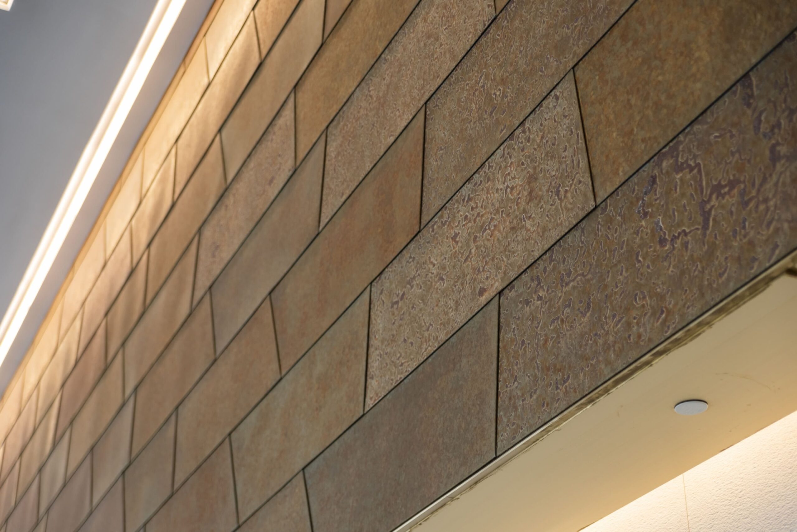 The lobby of the building features custom formed panels produced from Roano Zinc™. The custom configuration of the panels and the surface finishing was guided by the late Bob Schofield, Senior Vice President of Akridge. Bob Schofield worked closely with Bill Zahner at our Texas facility to achieve this unique surface of Roano Zinc™.