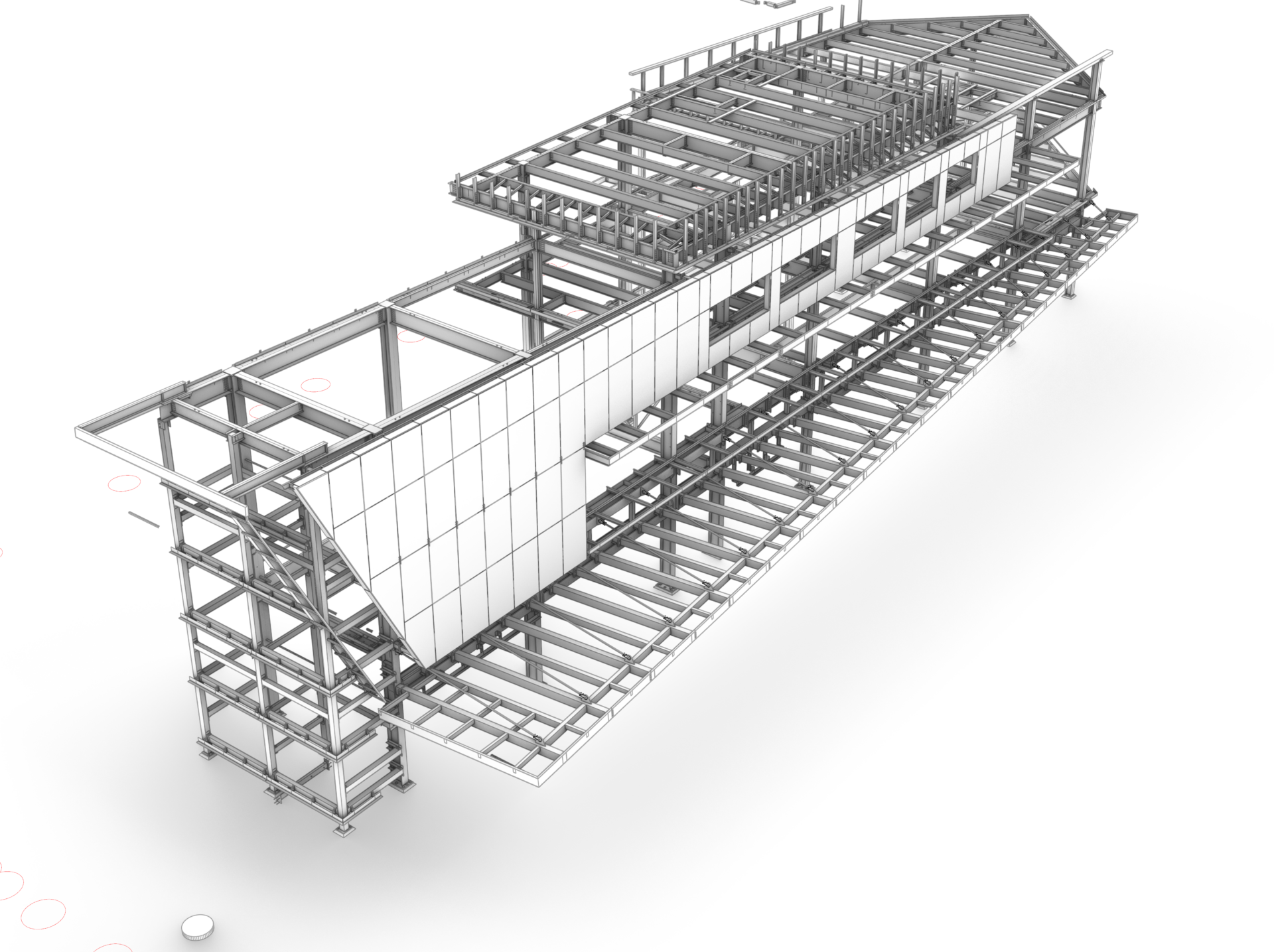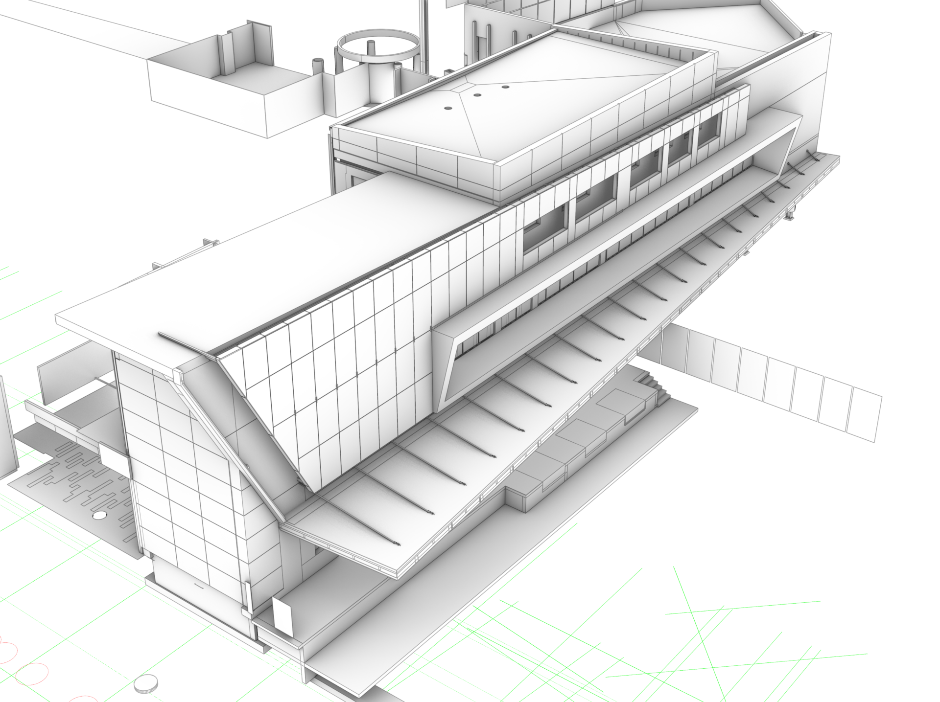 The perforated screen and wrapped elements create a calming sculptural facade that greets travelers approaching the terminal while also filtering views from the interior ticketing areas.