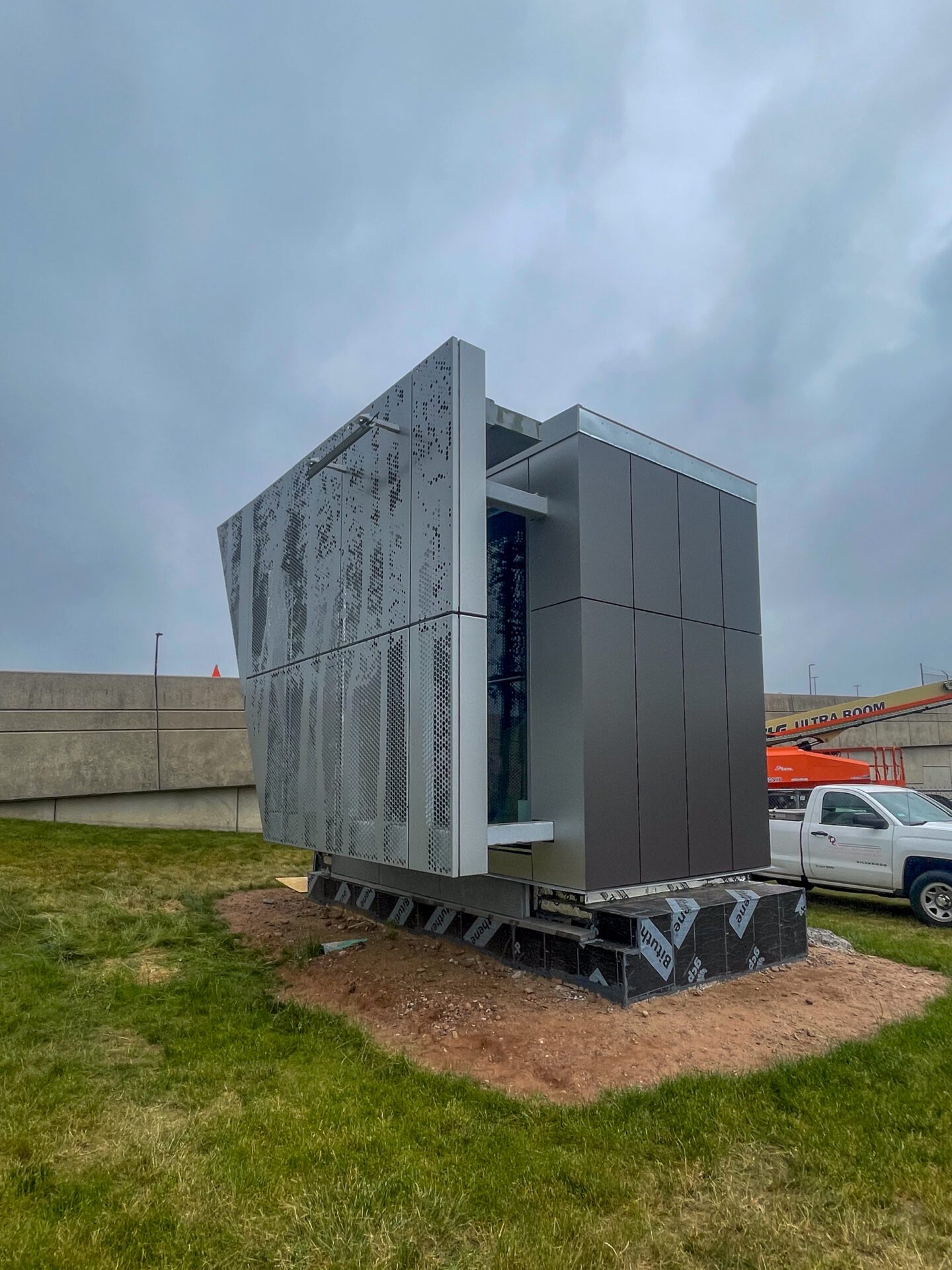 The ImageWall facade features painted aluminum panels finished in a “Sunshine Silver” color, perforated to create a four-tone image across the wall depicting a stylized forest landscape. Zahner worked closely with the designers to refine the perforation densities, ensuring the graphic would read clearly at scale while remaining compatible with fabrication constraints. The resulting pattern creates a layered visual effect that shifts depending on viewing distance and lighting conditions.