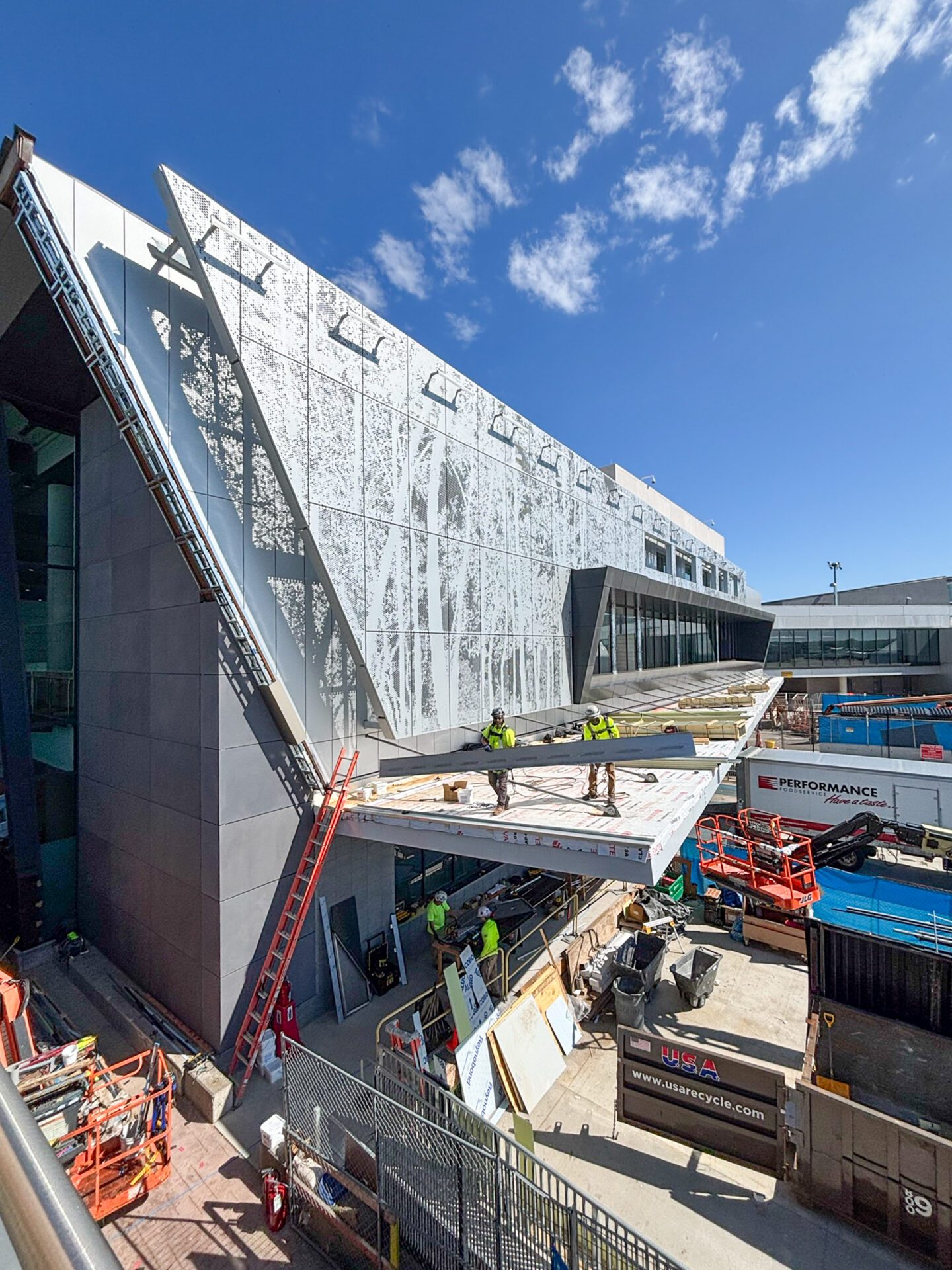 Designed by Fennick McCredie Architecture and constructed by Suffolk Construction, the project included a large perforated metal screen that spans a prominent portion of the terminal facade near the passenger drop-off area. The screen was fabricated using Zahner’s ImageWall® perforated metal panel system, in collaboration with installer Chandler Architectural Products.