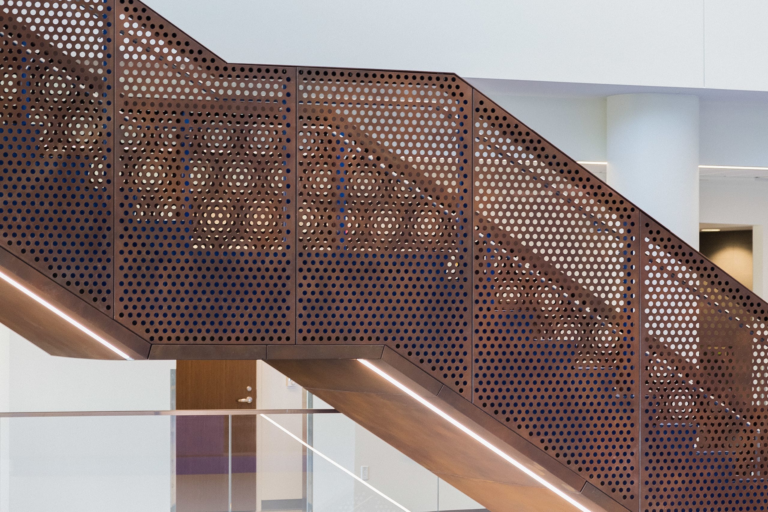 Capitol Federal Hall uses Solanum Steel for the exterior cladding, as well as perforating some of the guardrail panels. Zahner treated all interior panels with a matte sealant that maintained the surface quality of the steel, while preventing the patina from rubbing off onto people’s hands or clothing. Perforations were completed on the raw steel, then weathered afterwards to prevent any damage during the perforating process. Adding the finish post-fabrication also ensured that the inside of the holes maintained the same finish as the front of the panels.
