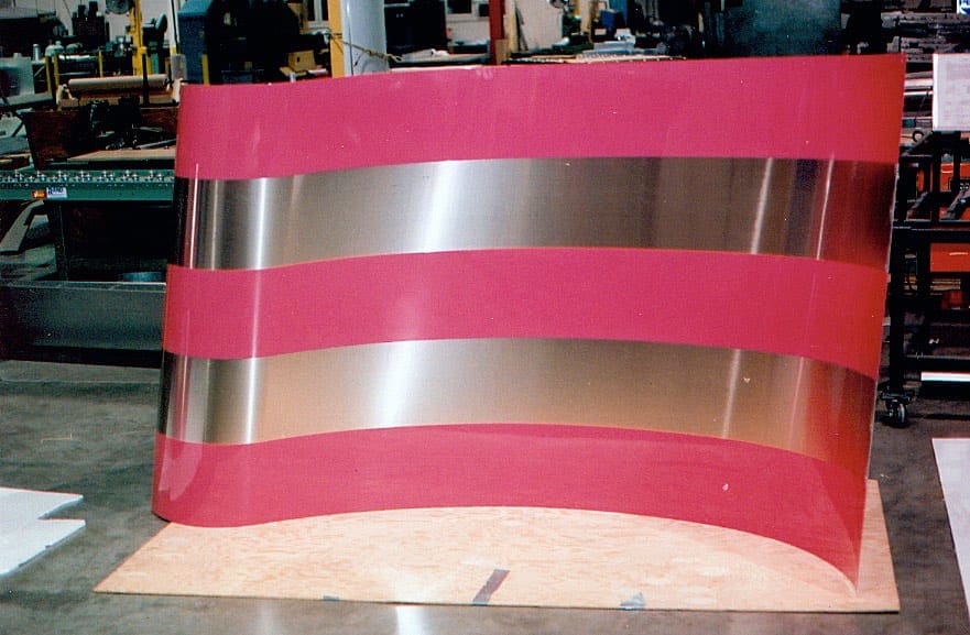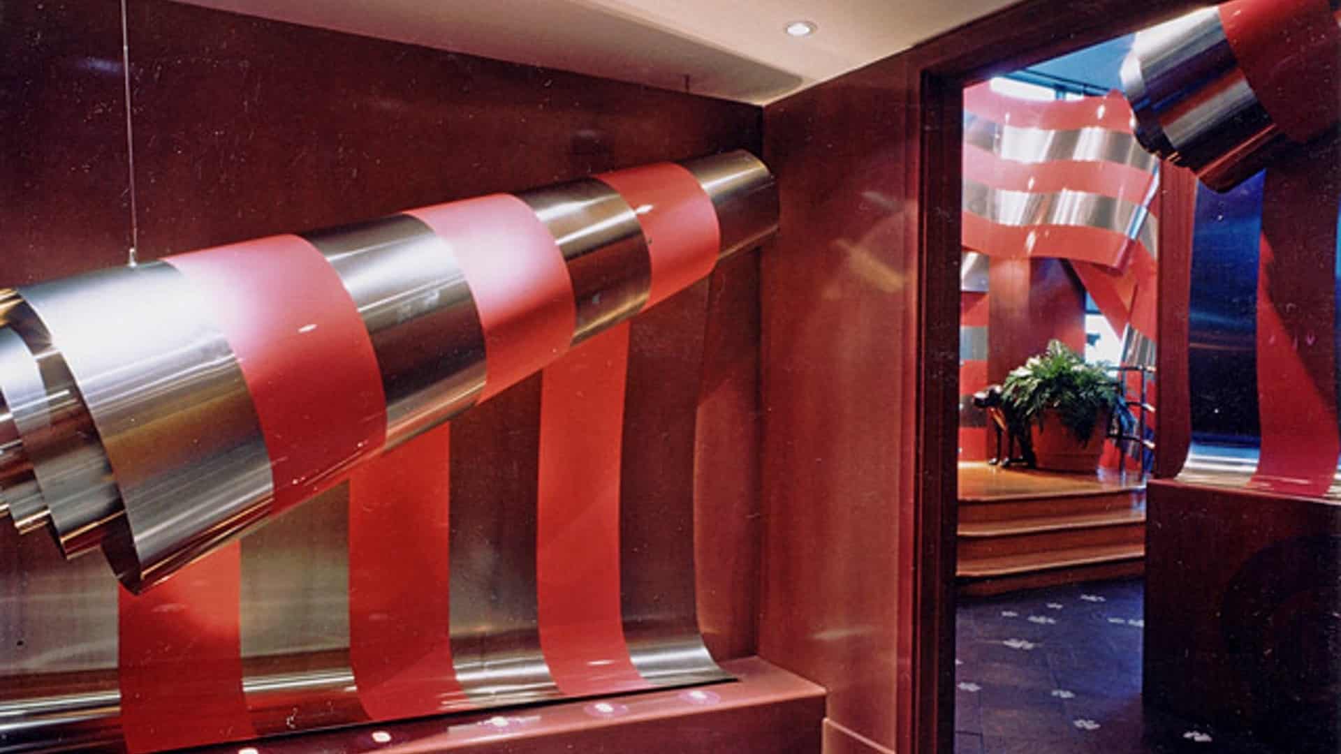 Designed by architect Chris Cooney and located in the Kowloon District of Hong Kong, the Cat’s Paw Lounge features a series of stainless steel ribbons manufactured by Zahner. Using the artist’s scale models, Zahner fabricated the stainless steel shapes and design-engineered the support system for the floating metal skins. Each ribbon is finished with a satin surface and painted red stripes.