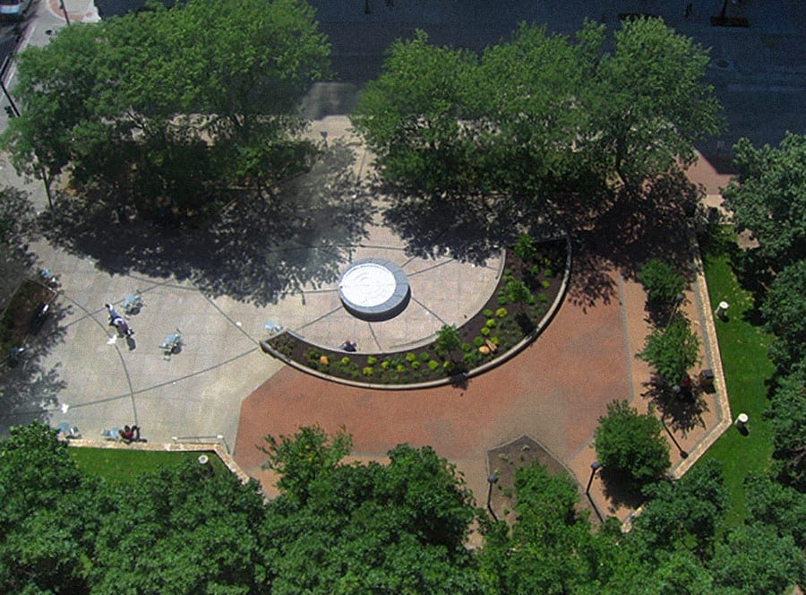 Celestial Flyways is a permanent interactive and kinetic artwork made through collaboration with Zahner art fabrication team. The public space includes a central piece by Laura DeAngelis entitled Star Disk, as well as a number of embedded stainless steel artworks inlayed in the concrete pavers. The artwork coincided with a complete redesign and rebuilding of Oppenstein Brothers Memorial Park at 12th and Walnut in downtown Kansas City. The park was dedicated April 18, 2008 and named Celestial Flyways to celebrate the natural environment of the Kansas City area.
