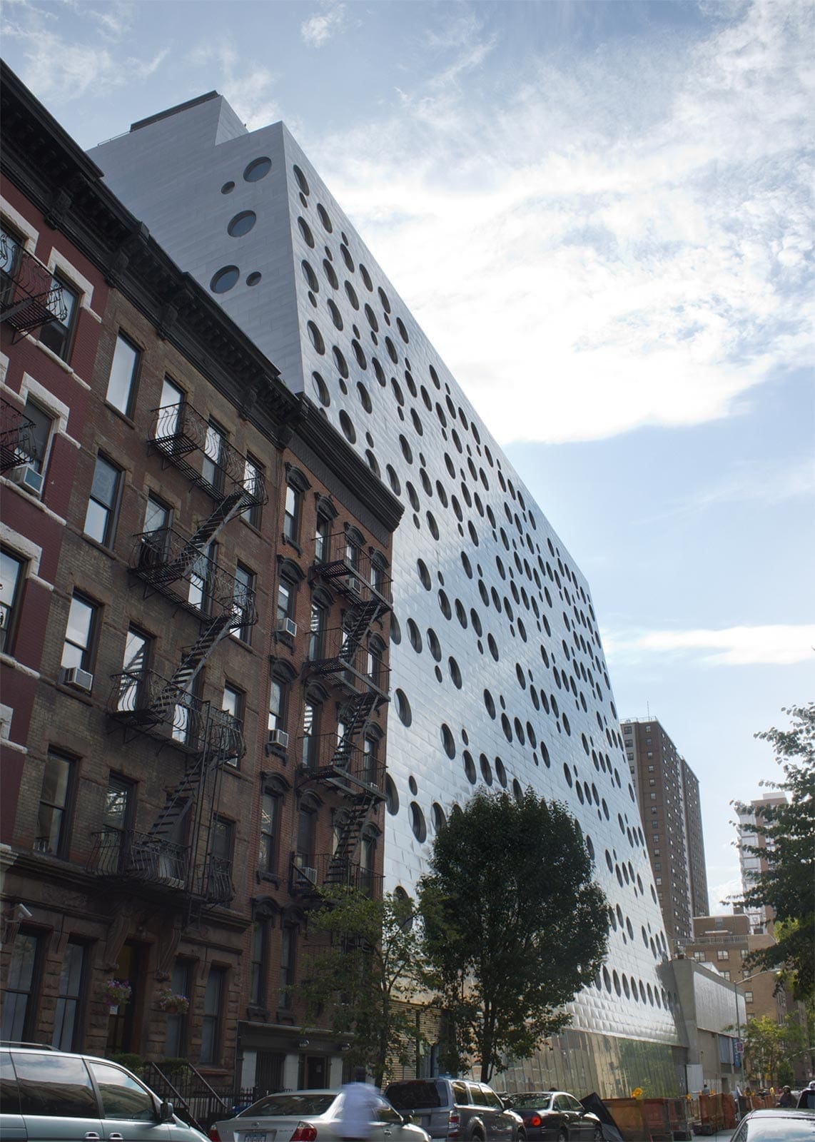 The Dream Downtown Hotel, designed by Handel Architects, features a Zahner engineered custom façade and window system. To mitigate glare, the stainless steel is custom finished to medium reflectivity. The perforated ZIRA system lends an element of visual interest and added rainscreen functionality.