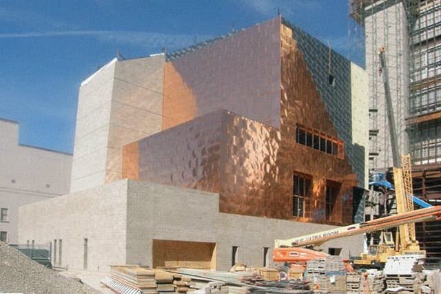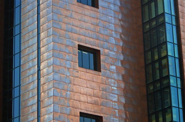 As the installers began cladding the building, the material began to blacken in areas as intended. This is caused by the oxidation of the surface, the natural process of patination on copper.