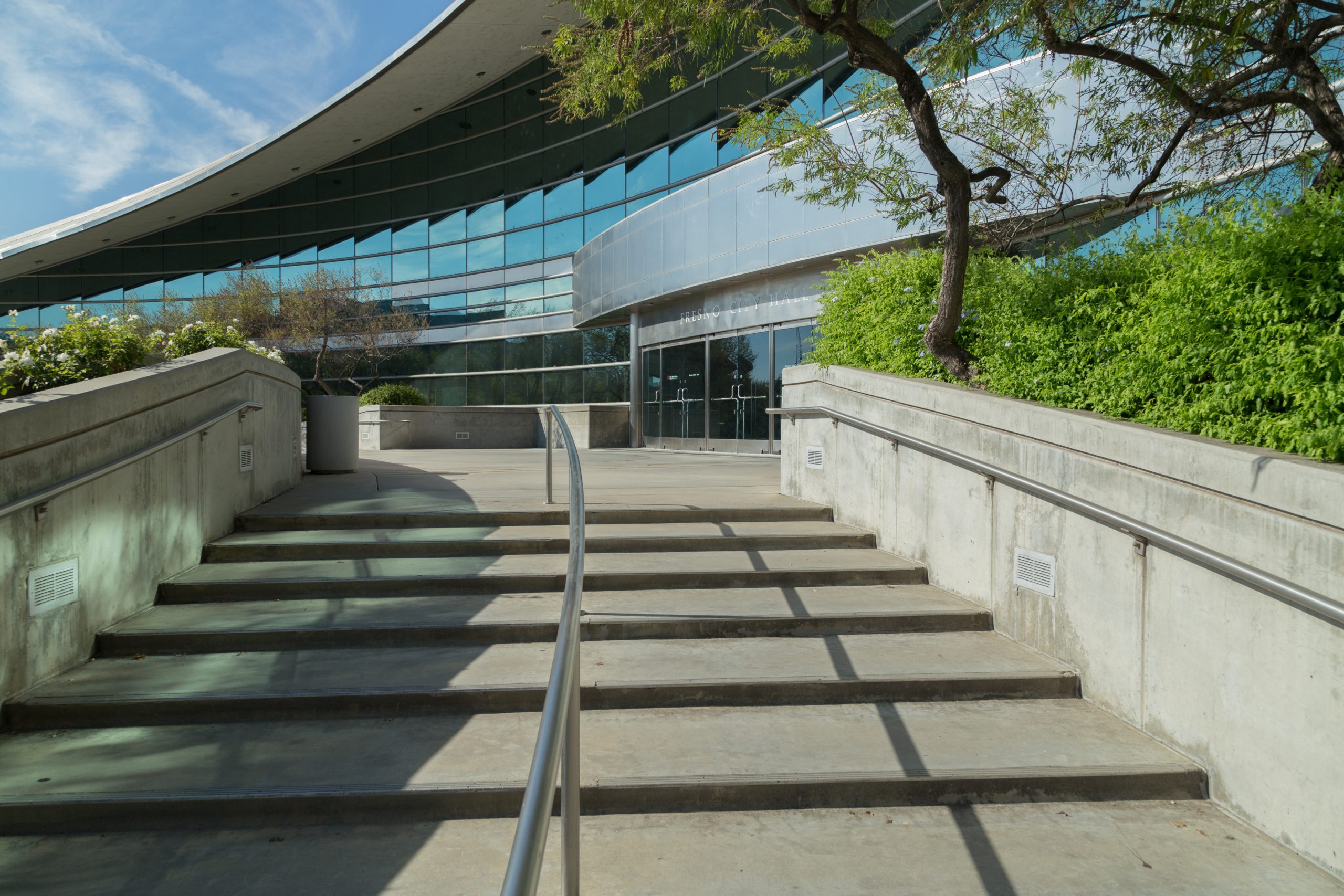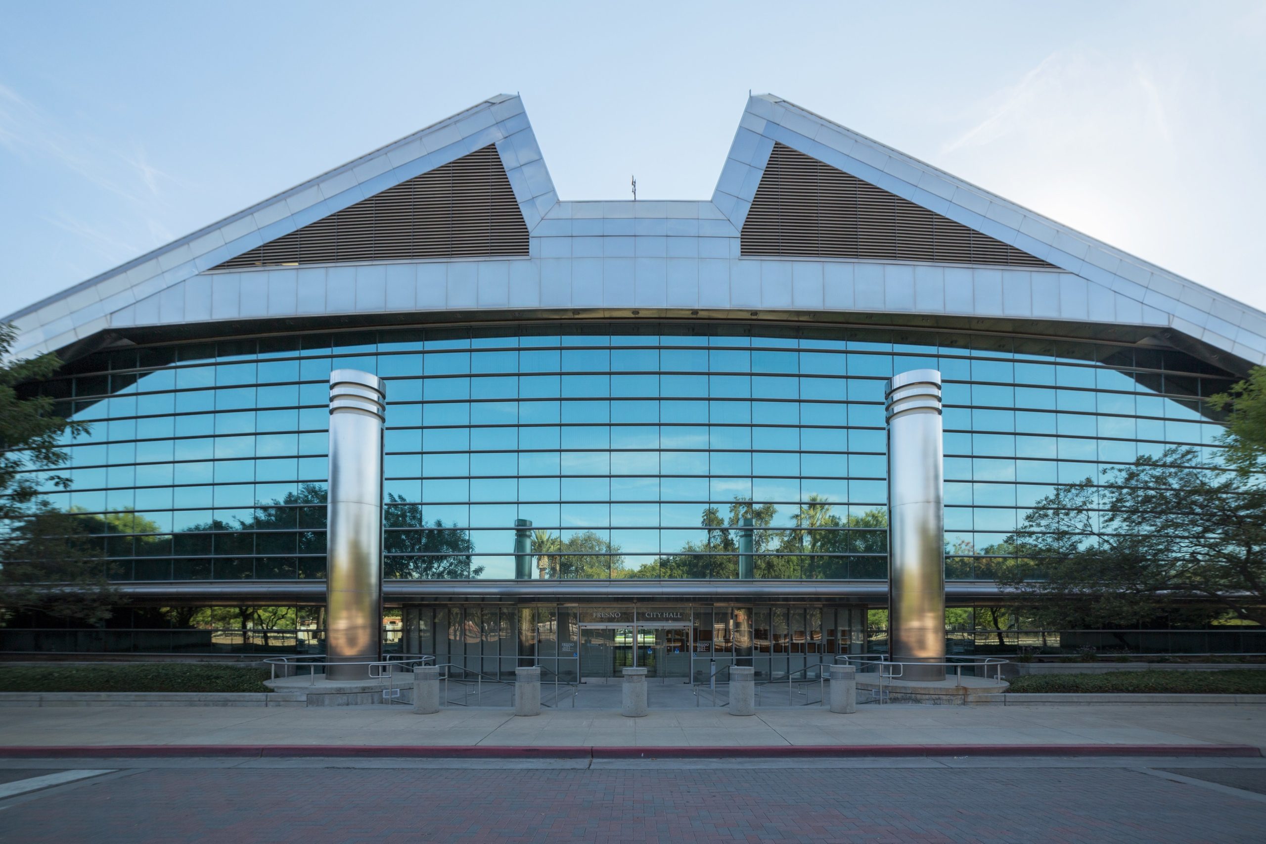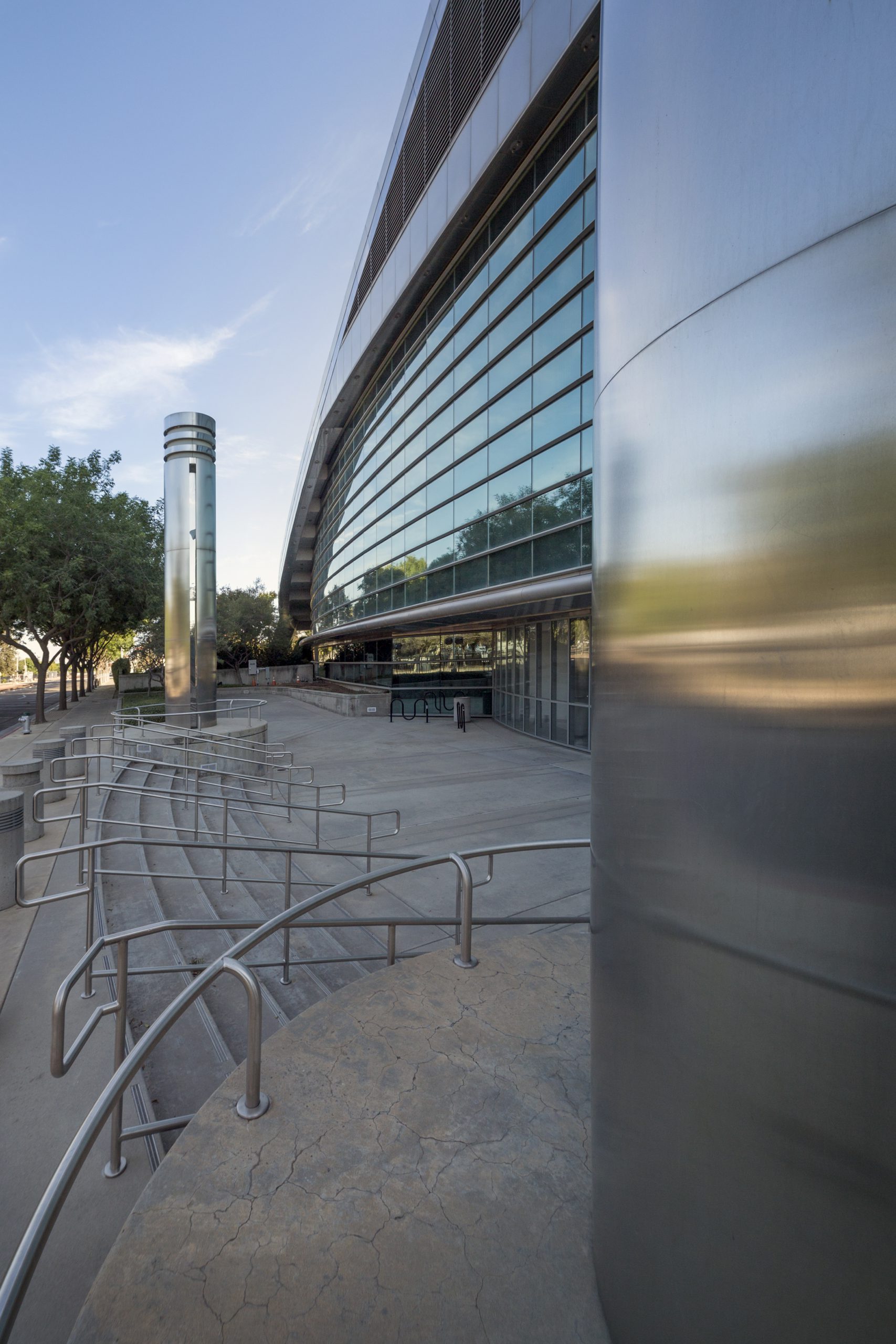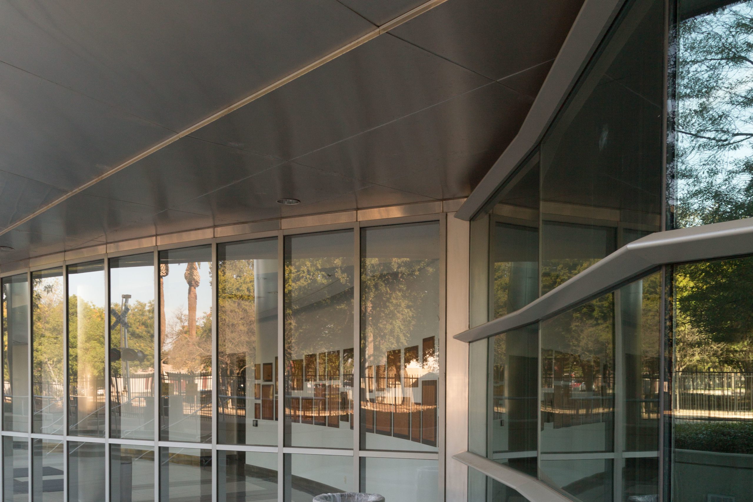The Fresno City Hall, designed by Arthur Erickson, features a number of Zahner-manufactured systems throughout the interior and exterior of the building. Developed with associate architects Lew & Patnaude and Edwin S. Darden & Associates, the building includes a massive stainless steel roof and facade with a muted finish provided by Zahner. The 300,000 SF structure is five stories high, and measures 66′ at its highest point.