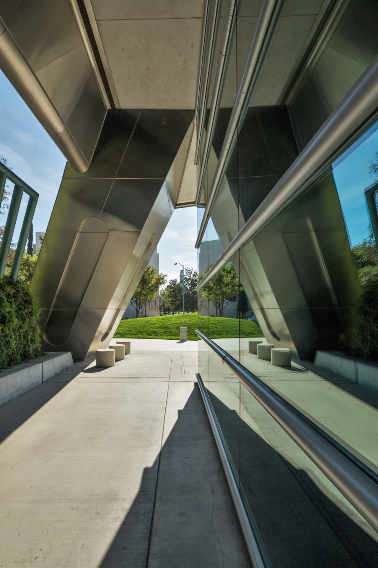 The building includes a range of metal details provided by Zahner. The metal aspects of its building envelope, the custom columns at its rear entrance, various soffit and metal cladding, awnings, mullions, and transoms.