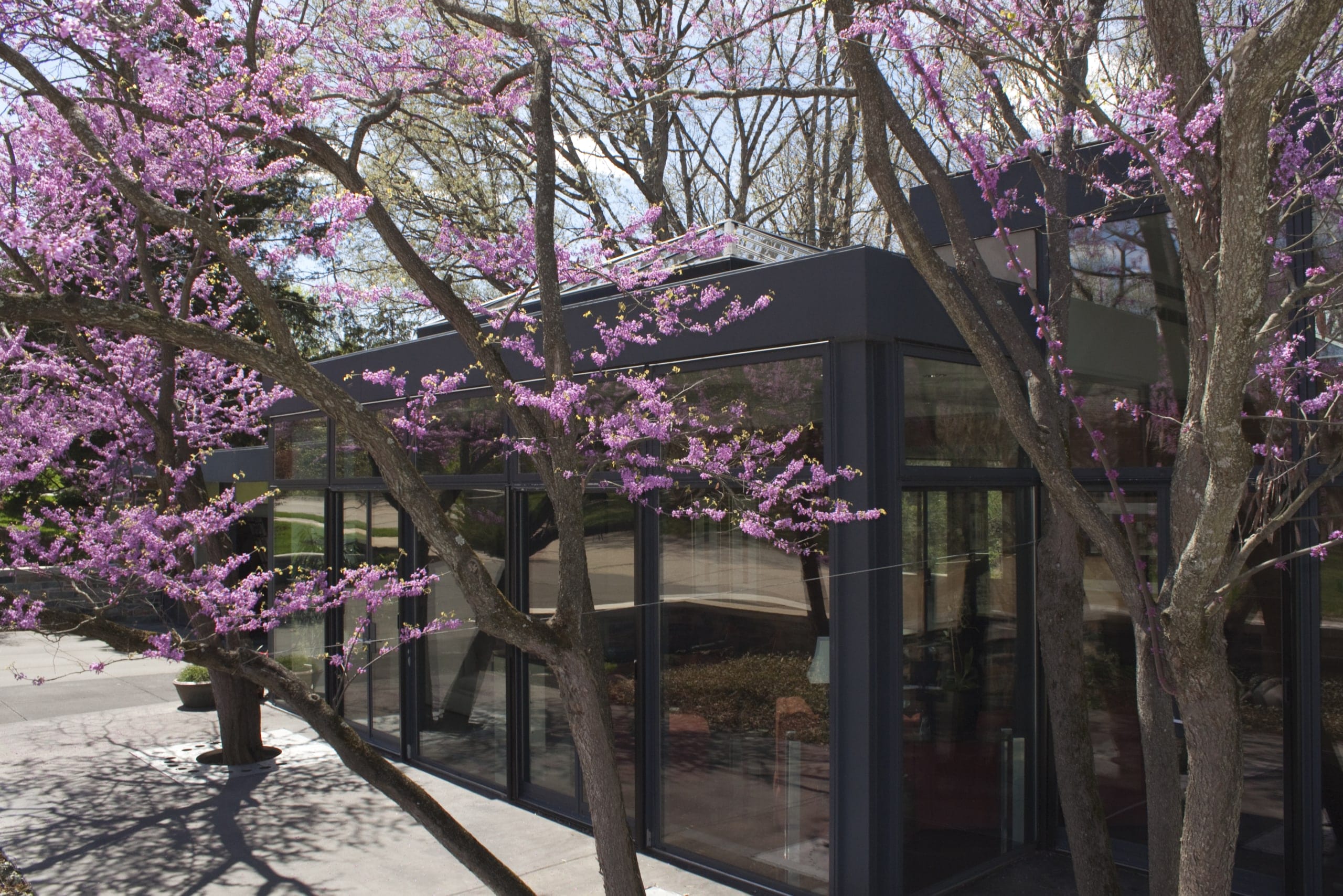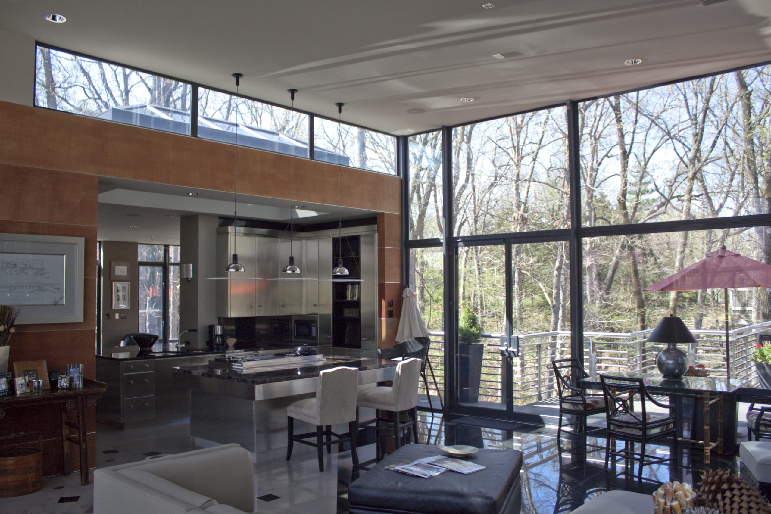 The building started off as a renovation, but the design transformation was fairly radical. The living and dining rooms open up to the front terrace with redbud trees which rise through custom, stainless-steel tree grates.