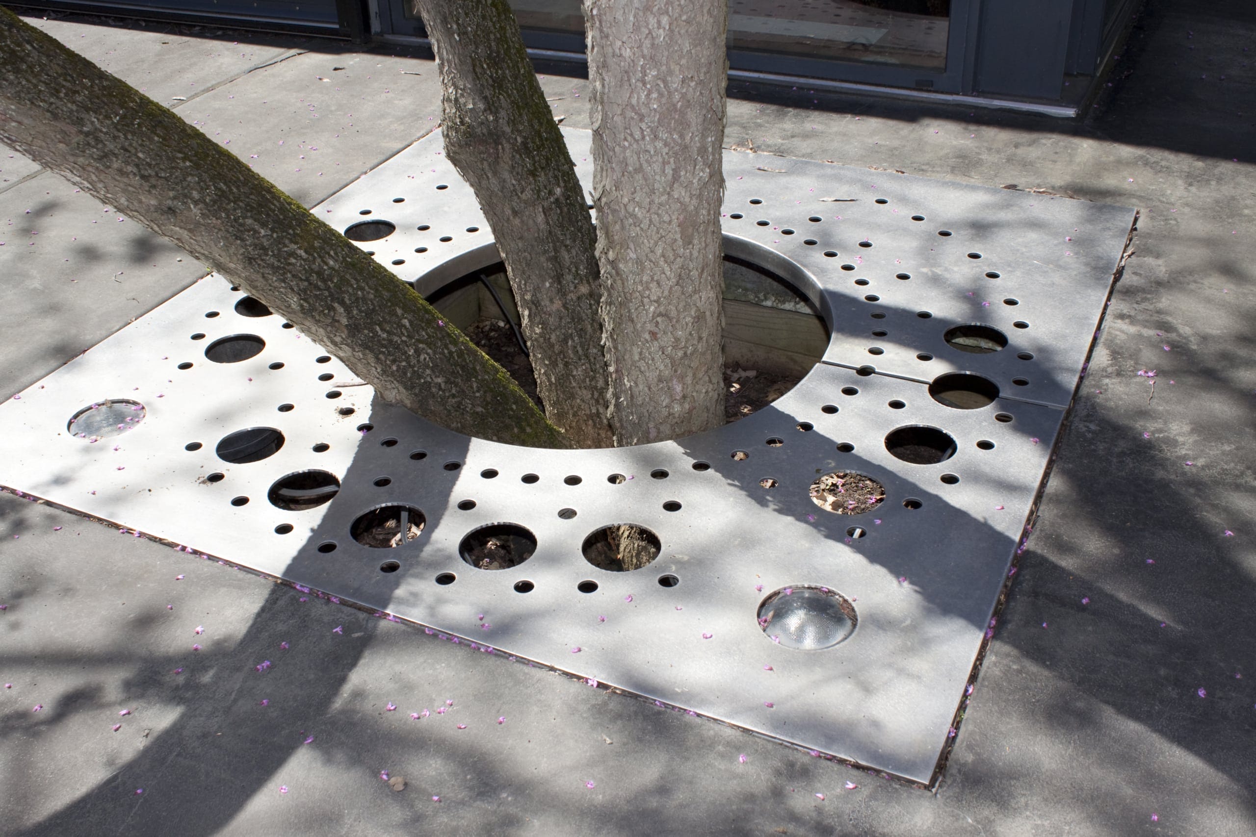 Each of these custom surfaces are used sparingly and in alteration to provide elegant accents the the residence. Zahner was hired to provide each of these stainless steel fabricated elements, as well as the custom railing, tree grates, and interior metalwork and various metal scopes within the residence.