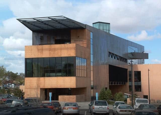 Built on the site of the original library, the design by Predock rises five stories to allow view of surrounding mountains and the Arkansas Valley. The building incorporates portions of the existing library and spans across Bates Lane to additional property to the South.