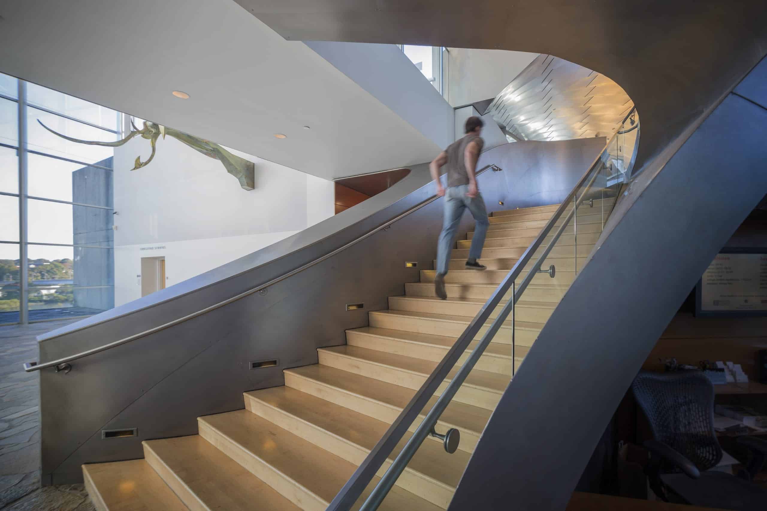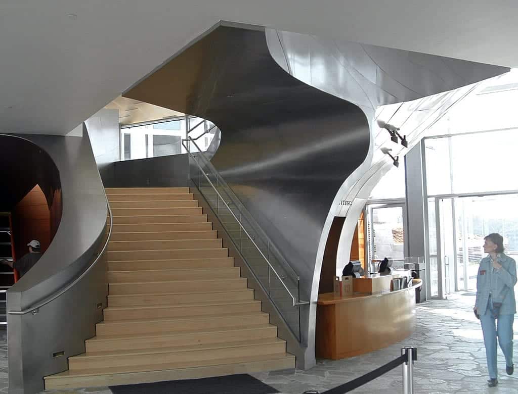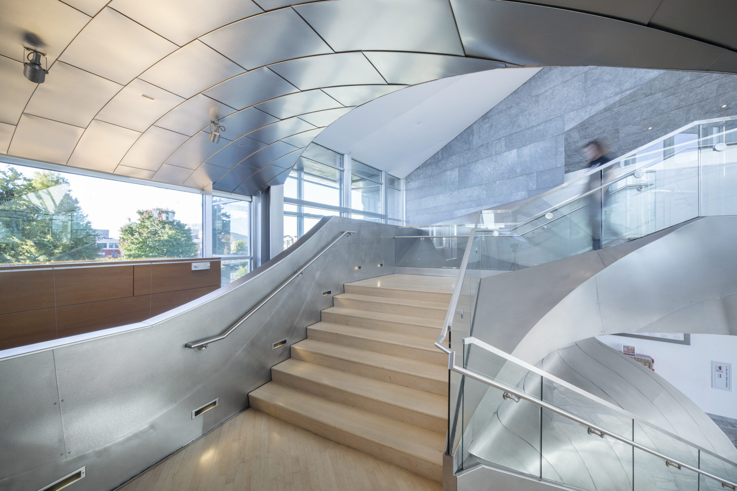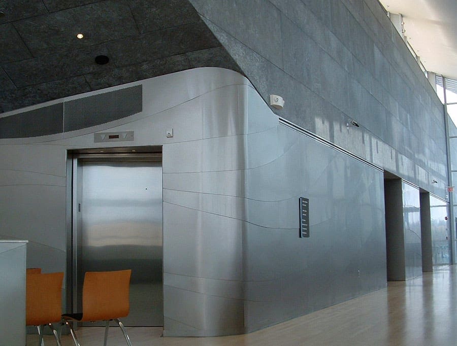 Zahner produced the geometric zinc metal surface as well as the curvilinear Angel Hair stainless steel roof forms, interior stainless steel stairway, and various metal details throughout the building.