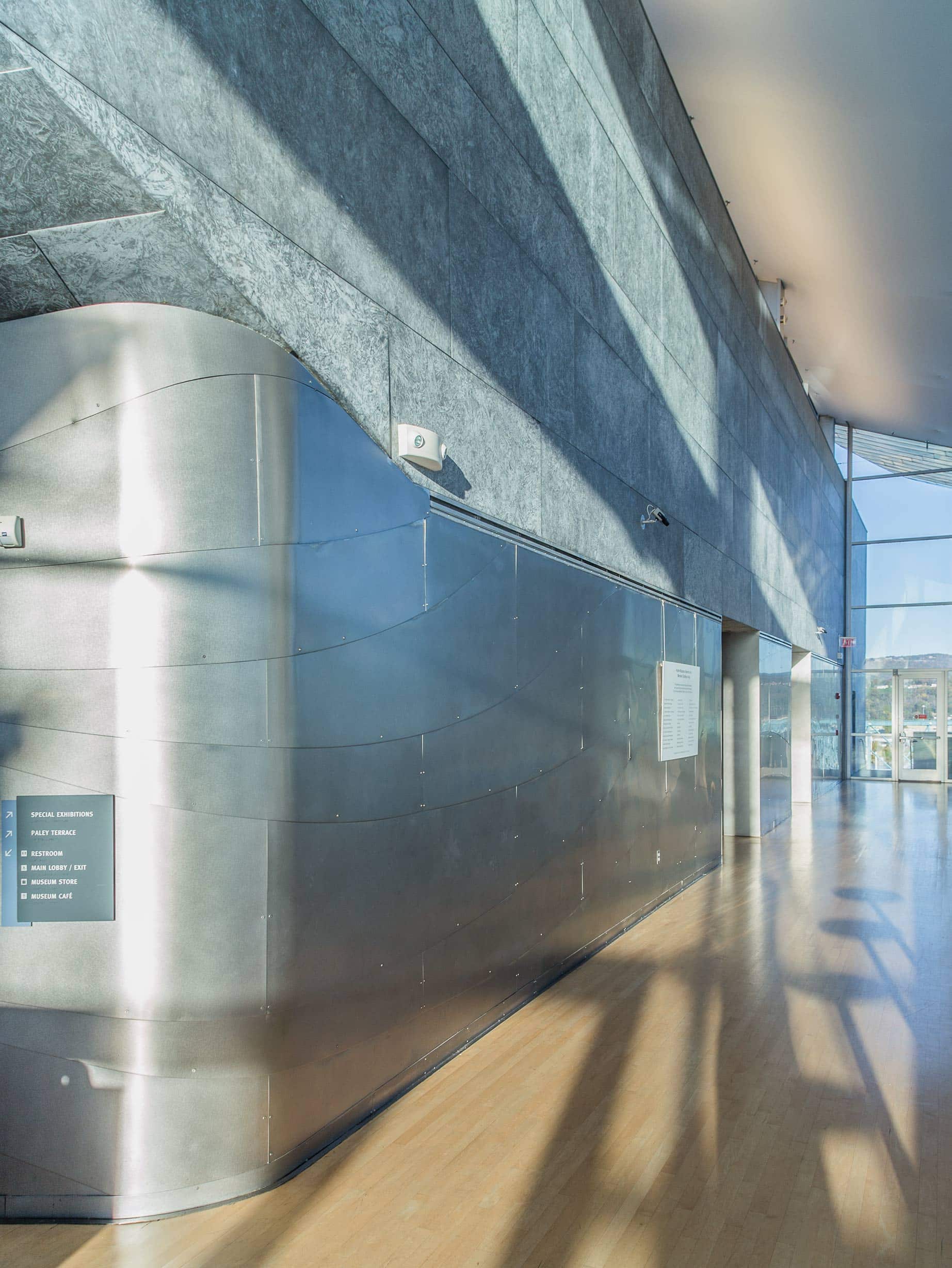 The bright curving stainless steel surfaces on the Hunter Museum use two signature Zahner systems, ZEPPS and the Inverted Seam system. These systems combine to make a roof which curves exactly as the architect’s original drawings. This curving surface is visibly seamless and completely protects the building against the elements.