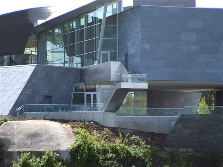 The architect’s specifications originally called for a limestone exterior in additional to the stainless steel curving roof. Limestone would have cladded the vertical walls as well as many of the slanting angles throughout the building. As the project progressed, it became apparent that installing limestone was implausible in many areas due to the structural weight of the material.