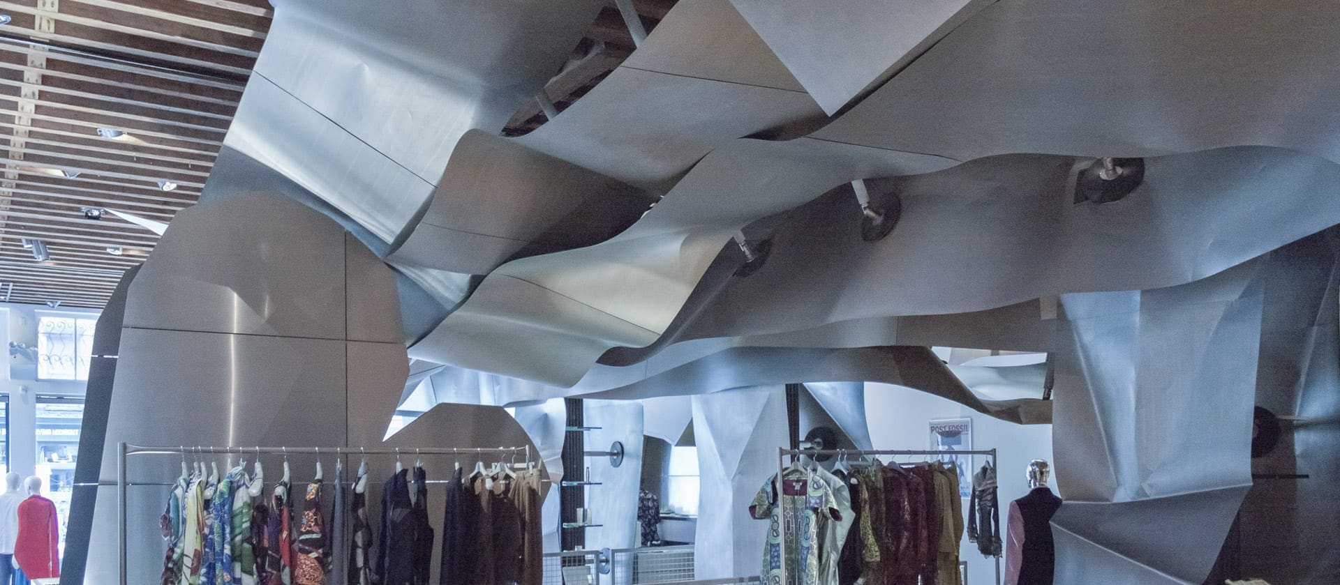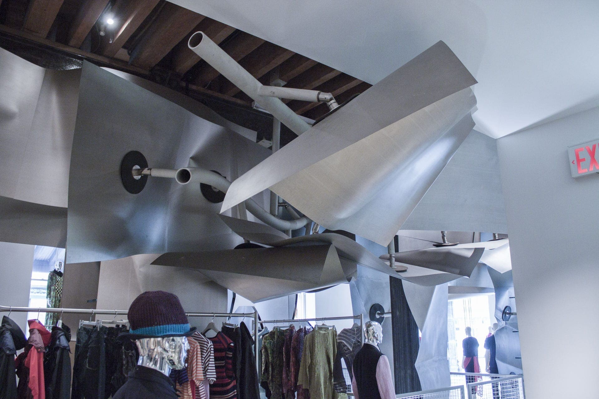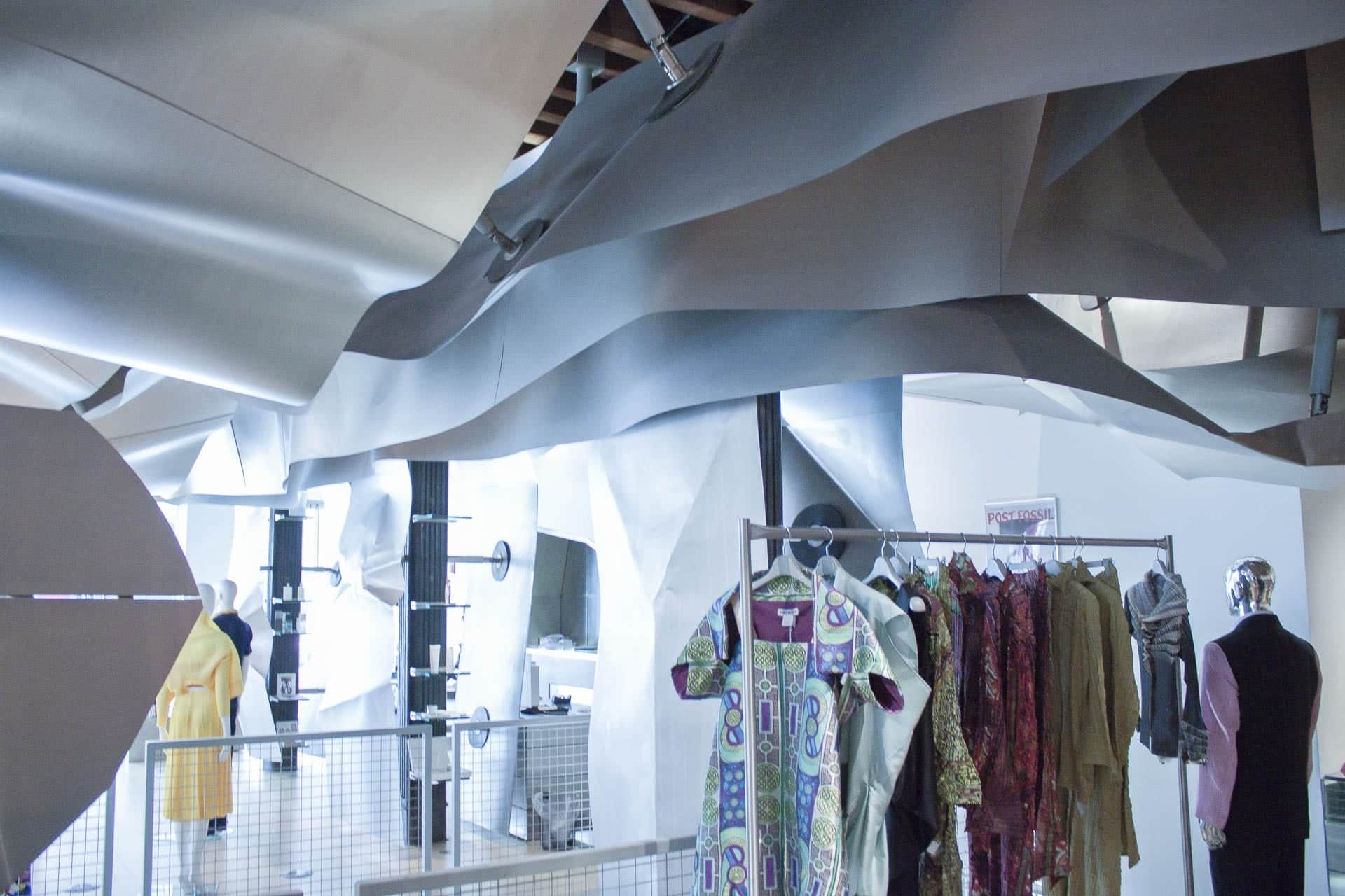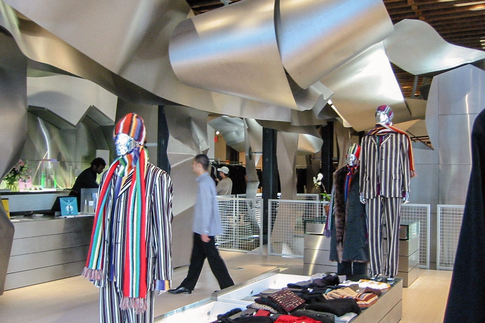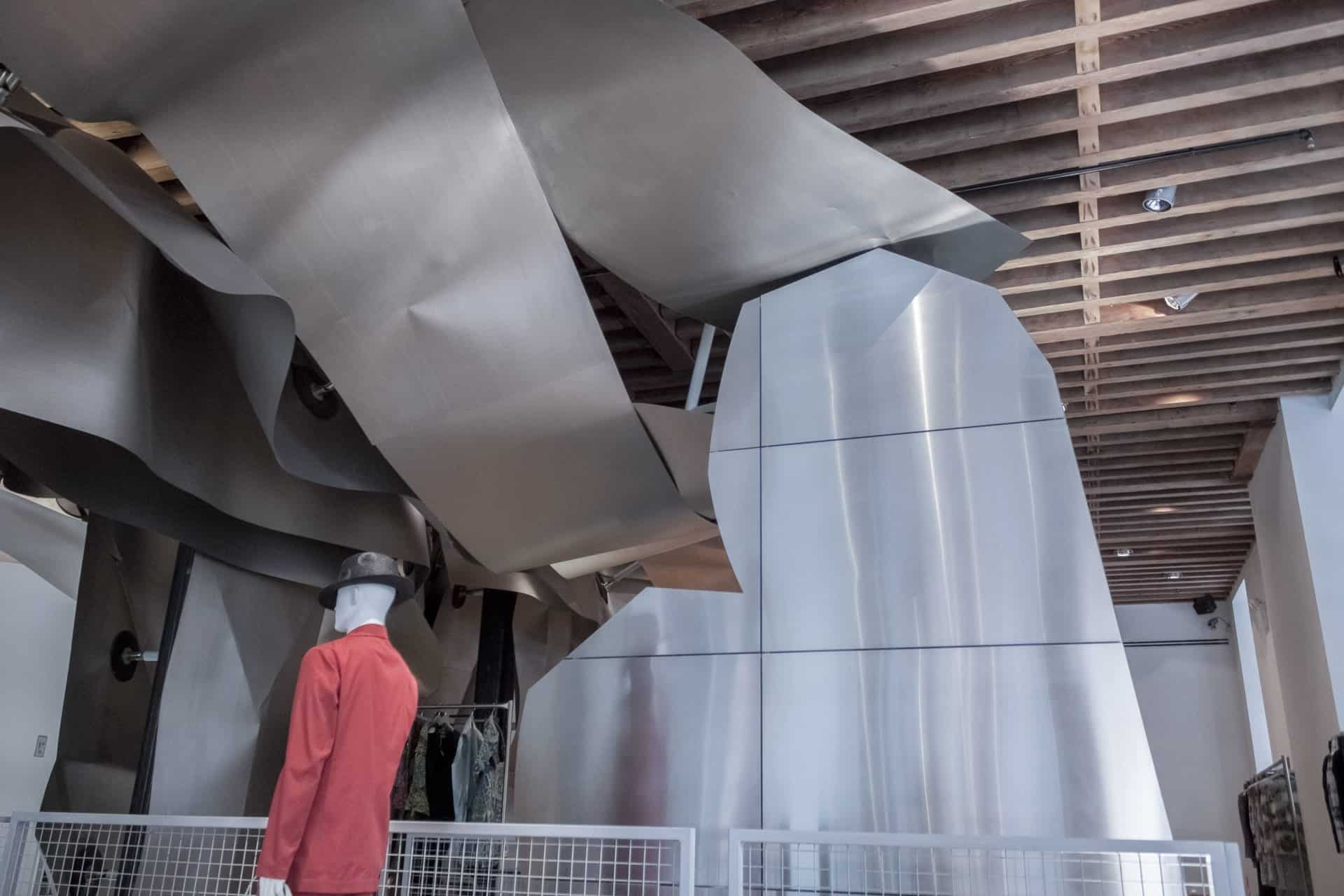 Issey Miyake Tribeca is a retail store for the Japanese fashion designer Issey Miyake designed by Gordon Kipping (G TECTS) with Frank Gehry in a historic cast-iron warehouse building. Located in in the Tribeca neighborhood of lower Manhattan, the store integrates a sculptural titanium ceiling and wall system designed by Frank Gehry Partners as a center piece, extending from a shaft emerging from the cellar floor into a turbulent swirl engulfing the ceiling of the ground floor retail space.