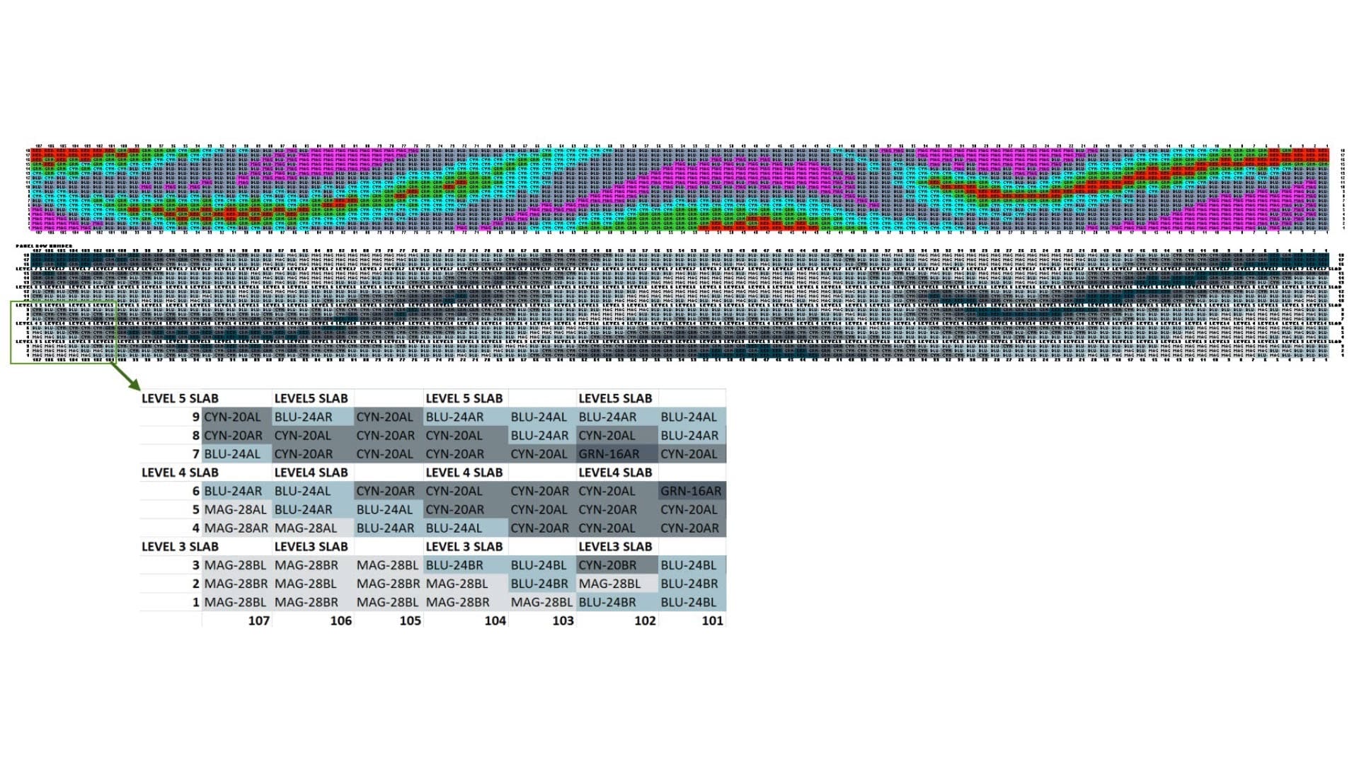 Digital model of the IwamotoScott facade, color-coded to indicate its five repeating panel types.