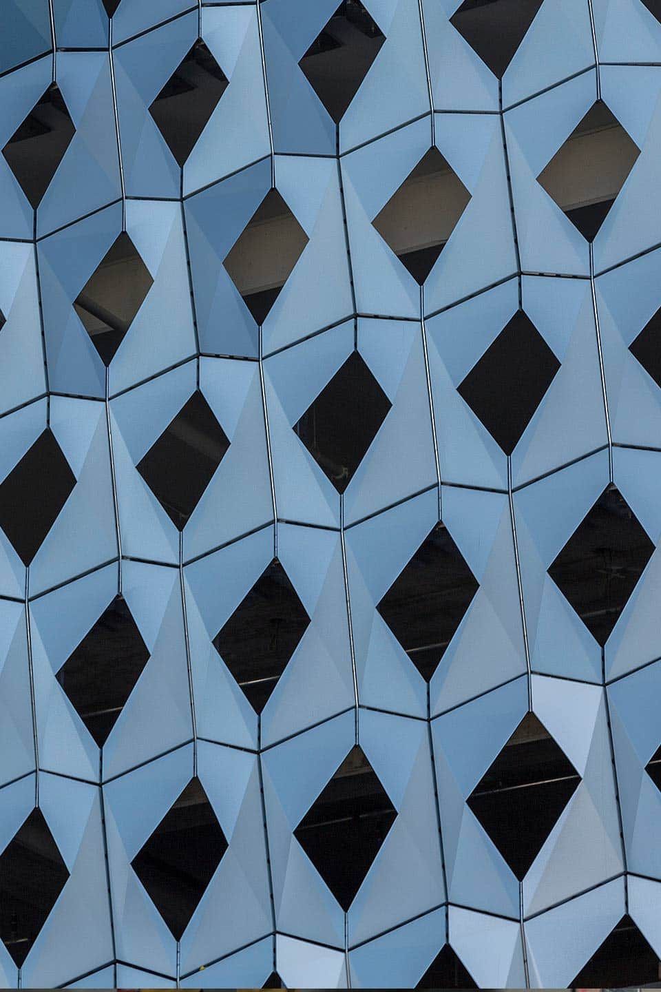 A geometric display of varying blue-toned aluminum skins adorns the Southeastern facade of the City View Garage in the Miami Design District. Designed by IwamotoScott Architecture, the Zahner-manufactured facade was developed in Kansas City and shipped as nesting parts to the job site in Miami, Florida. Zahner field installers hung the panels.