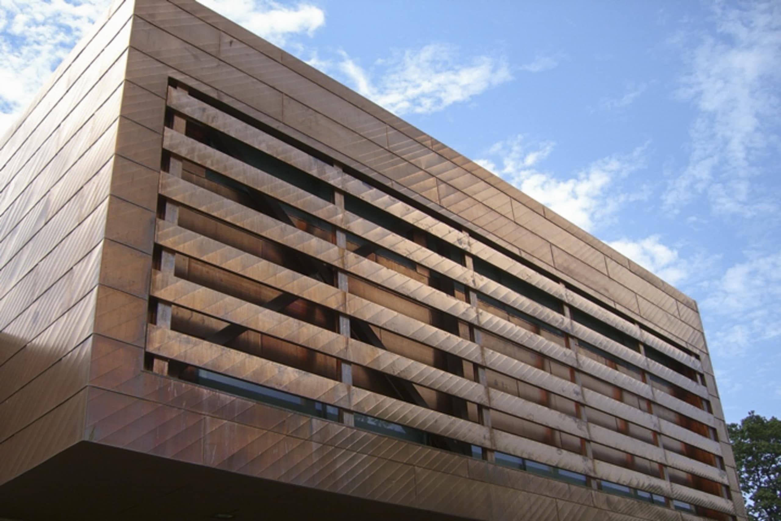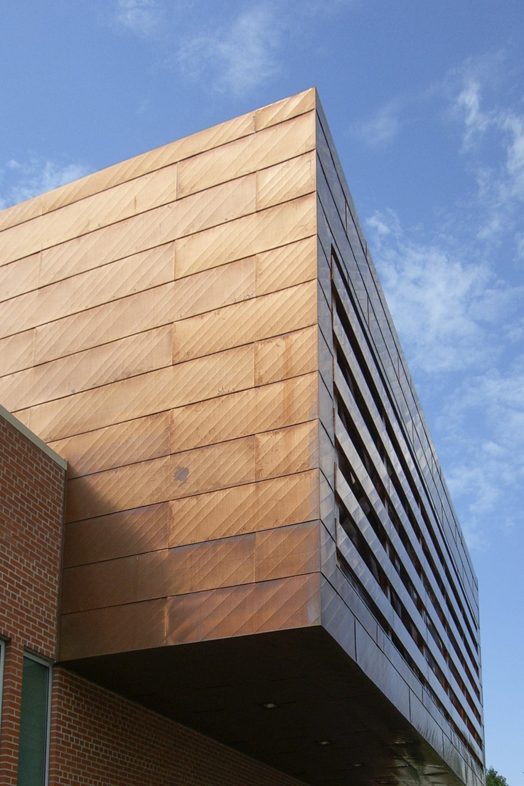 The building is clad in a variety of metal surfaces developed by Zahner — copper, zinc, and aluminum adorn the building in near equal parts. The copper was installed as a raw “red” sheet with the intention that it would weather over time and eventually become green. This process will take 10 to 20 years typically.