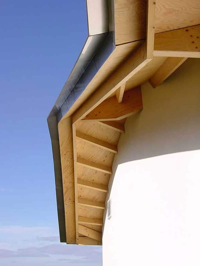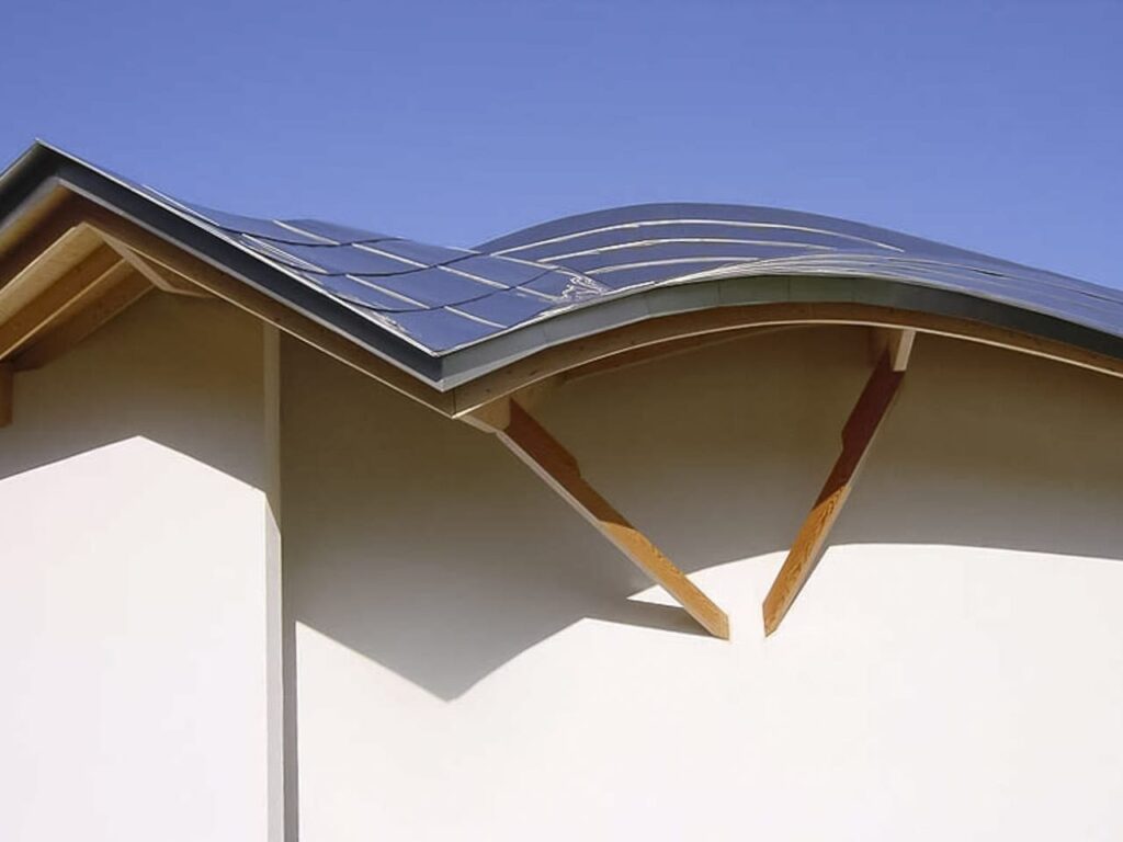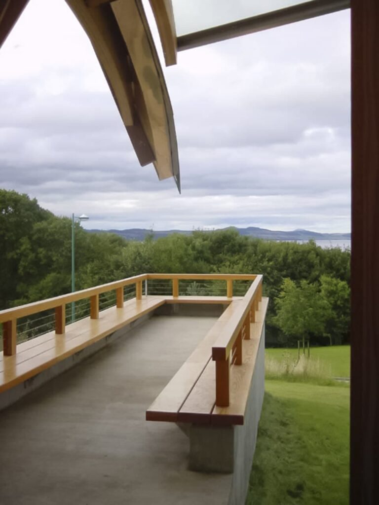 This project involves a labyrinth in the structures front yard, and an elaborately curved stainless steel roof. Zahner donated labor and fabricated the stainless steel roof at cost, which was then shipped to Scotland and installed by local labor. The project was completed in the same year as Bard College, also produced by Frank Gehry Partners with Zahner.
