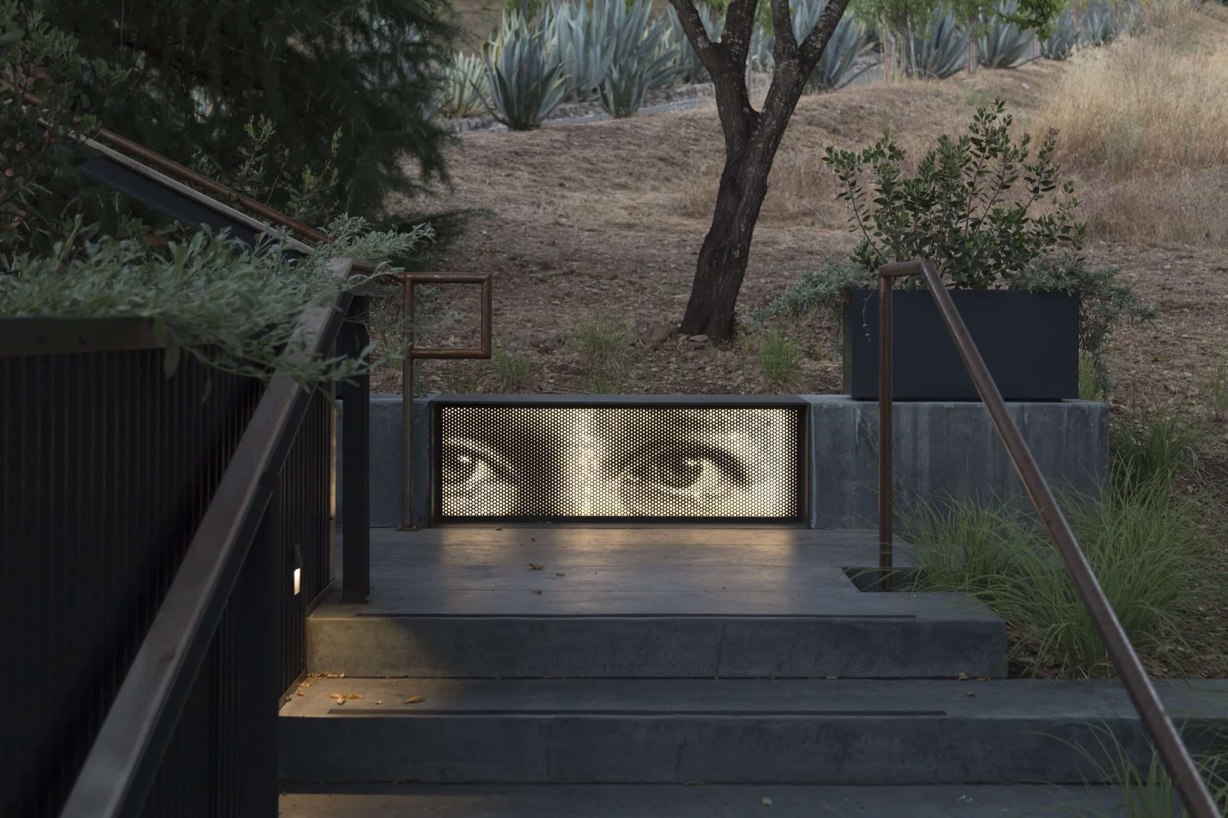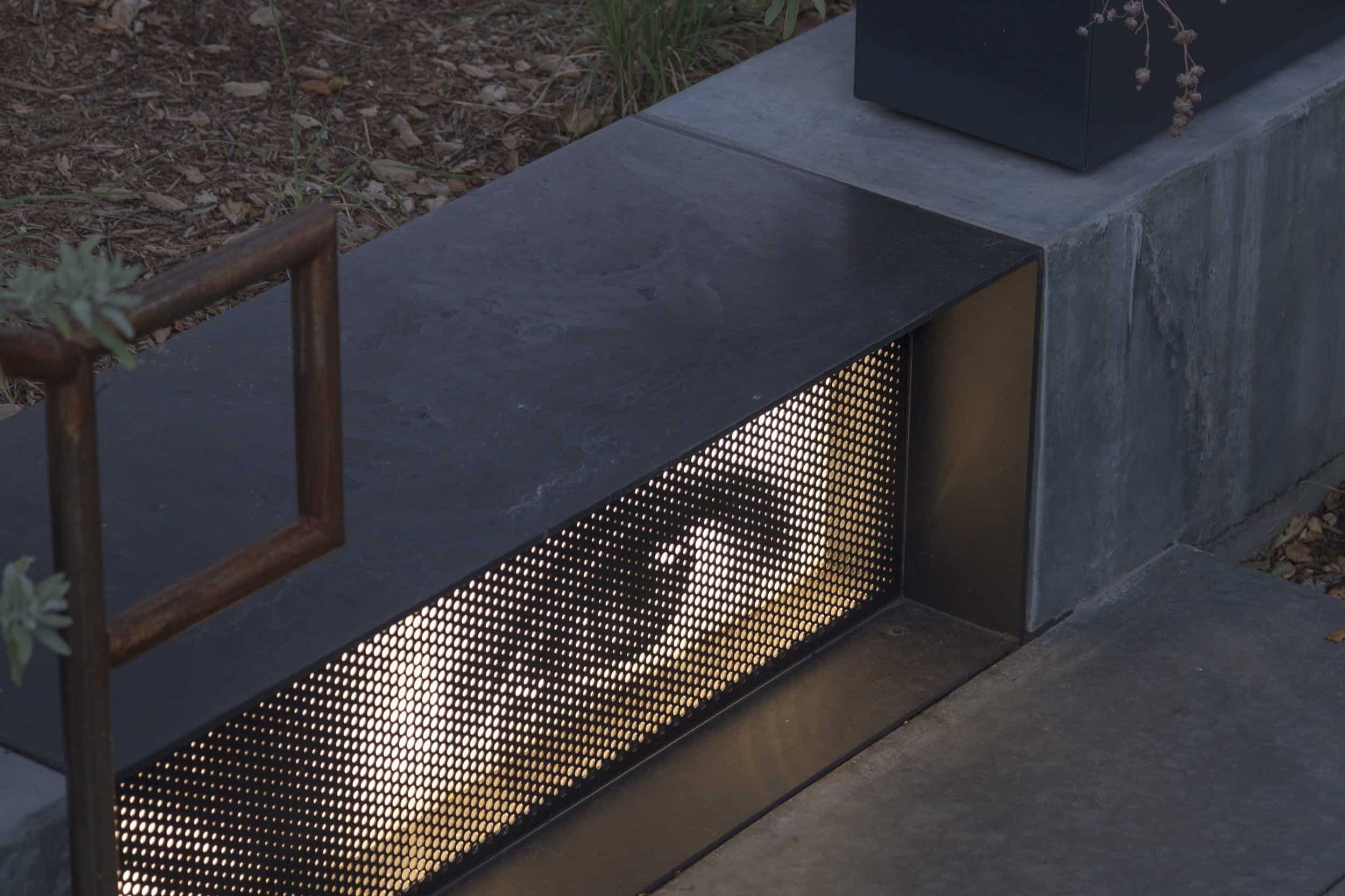 Detail of finely perforated painted aluminum panel which forms the front of a metal seat.