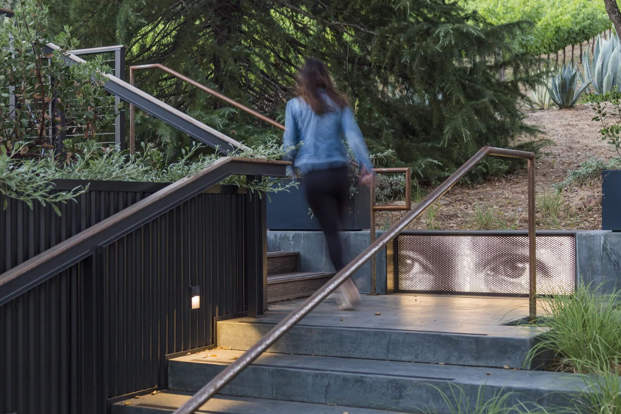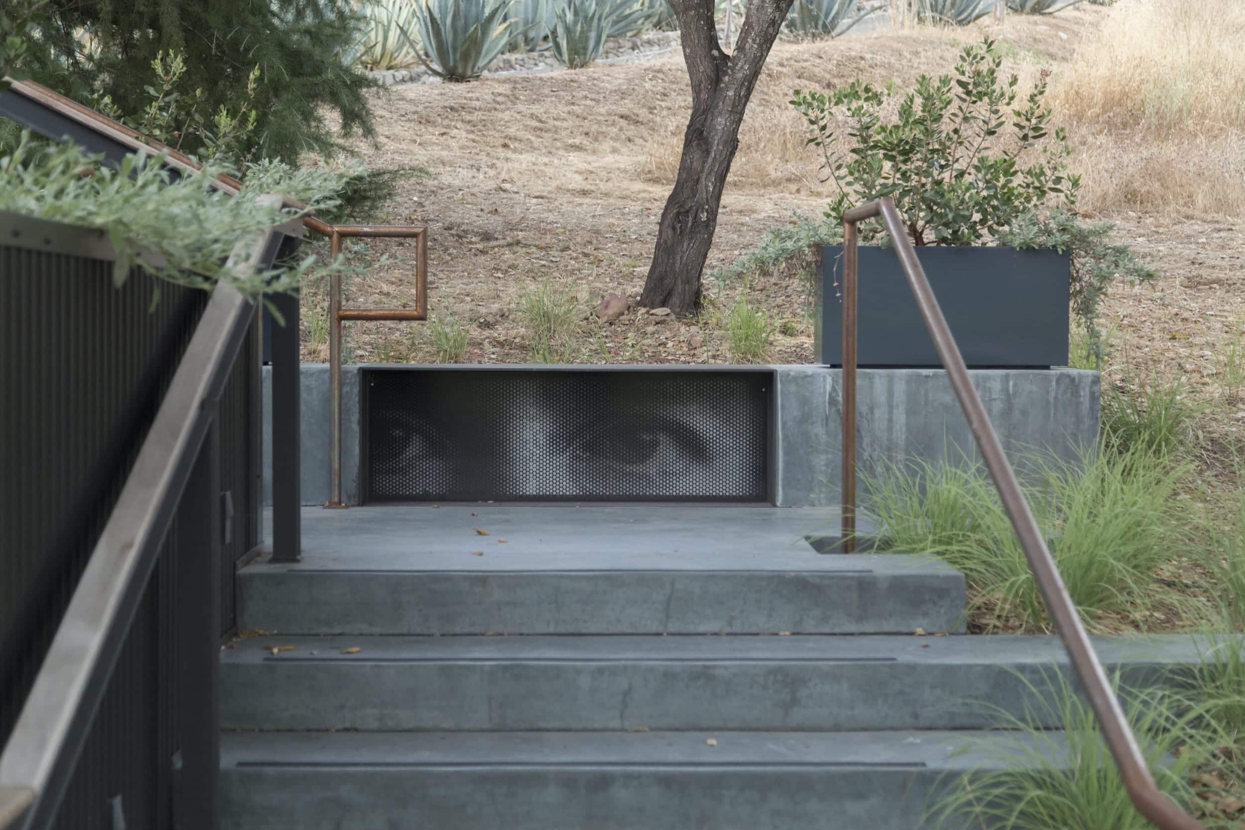 A single, finely perforated painted aluminum panel which forms the front of a metal seat.