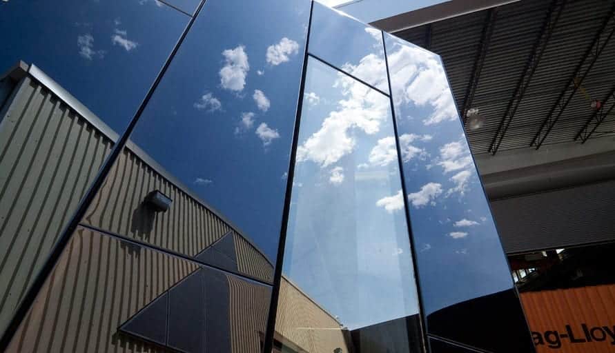 The material that was selected for this is a seductive dark mirror-polish stainless. Zahner has used a similar finish on a few projects, including a Libeskind-designed residence in the northeast United States. This metal surface is essentially a dark-tinted mirror, reflecting a darker image of its surroundings with perfect mirror accuracy, and imbuing the imagery of the sky and general surroundings on its dark polished surface. The image immediately above shows a detail of the reflected surface of both the inset glazing and the slightly darker reflective metal surface. The Zahner product that enables the flush glass and metal surfaces is called the Inverted Seam™ Glass System.