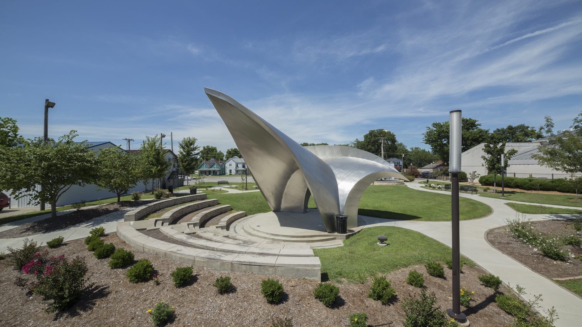 The Carl Lee Park Pavilion and Bandshell is a sculptural form which features Zahner manufacturing and engineering technologies. Designed by artist John Medwedeff, this public art project is located at the town center of Murphysboro, Illinois. The project was completed in 2010, and measures 35′ long. The artwork provides a small amphitheater for the town’s public park where musicians perform outdoor concerts.